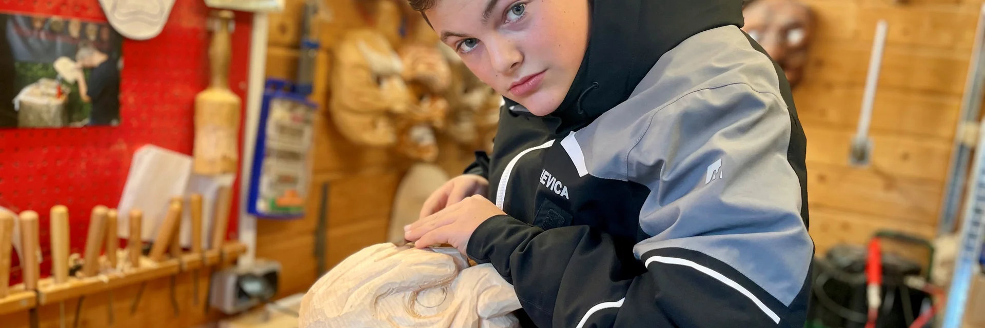 Armin verbringt neben der Schule viel Zeit in seiner Werkstatt. Mindestens zweimal in der Woche, meint der 13-Jährige und lacht: „Mir kommt vor, im Frühling und im Sommer sogar mehr als im Herbst und Winter“. Für seine Schnitzarbeit verwendet der Tauplitzer entweder Zirbenholz oder Weihmutskiefer. „Alles beginnt mit einem Viertel eines Stamms“, ergänzt Jürgen. Mit einer Motorsäge schneidet Jürgen den Stamm zurecht, der anschließend in die Vorrichtung gespannt wird. „Für das Grobe bin ich zuständig“, lacht der Vater zweier Kinder.