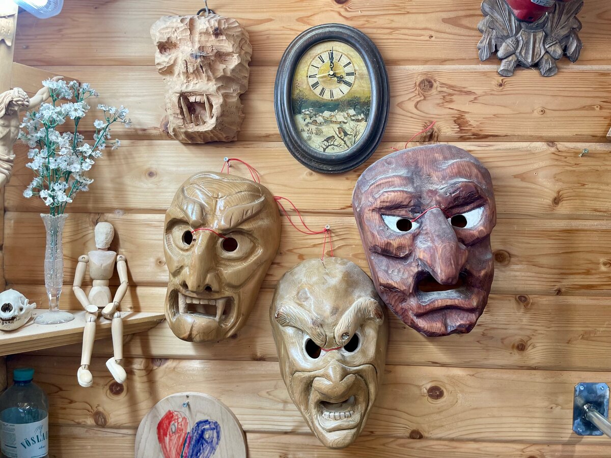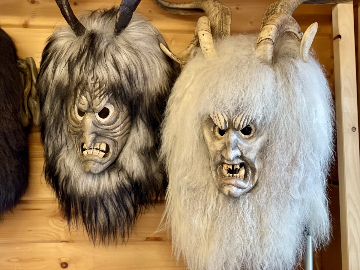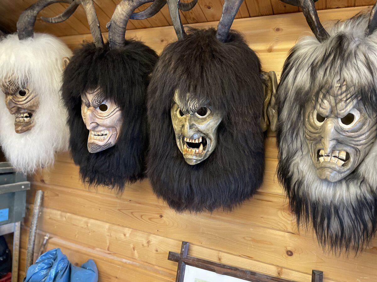 Einer davon ist Armin Hochrainer, 13 Jahre alt und bekennender Krampus-Fan. Mit sieben Jahren hat er sich zum ersten Mal eine Kindermaske beim Gasthof Thomahof – der bereits seit Jahrzehnten an der Organisation der Tauplitzer Nikolospiele mitwirkt – ausgeborgt und hat bei den Kinder-Nikolospielen mitgemacht. „Mit acht Jahren habe ich mir meine eigene Maske geschnitzt – mit zwei Messern auf den Fliesen in unserem Haus“, erzählt Armin lachend. Mittlerweile hat der Tauplitzer bereits acht fertige Krampusköpfe und unzählige Kindermasken geschnitzt. Traditionell werden im Thomahof die Masken und Kostüme für die Nikolospiel gelagert, die während des Jahres auch ausgestellt werden. Armin erzählt, dass er bereits einige Masken und sogar drei Köpfe für das Gasthaus geschnitzt habe, die sich mitwirkende Kinder für das Nikolospiel dort ausborgen können.