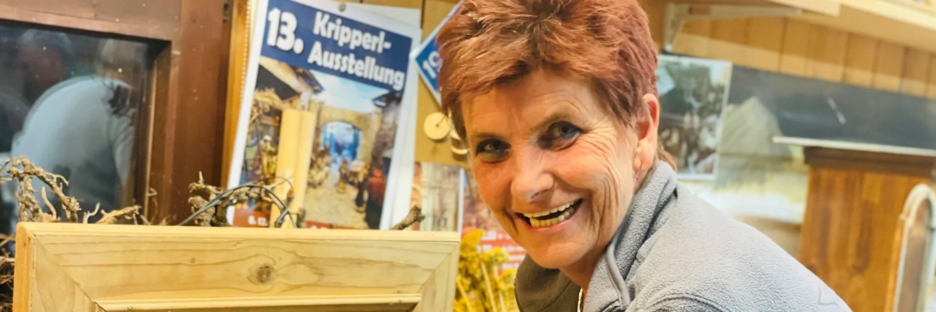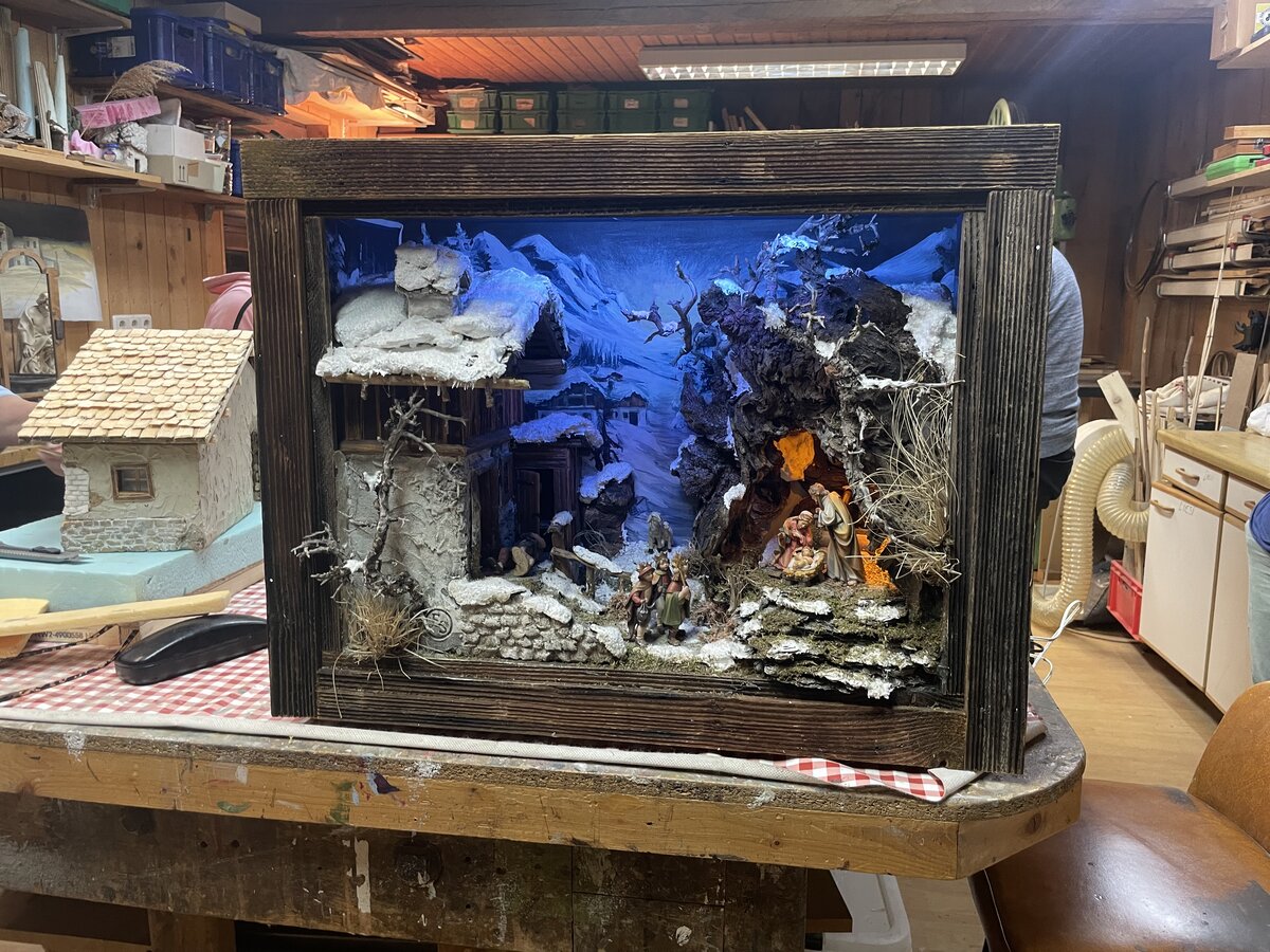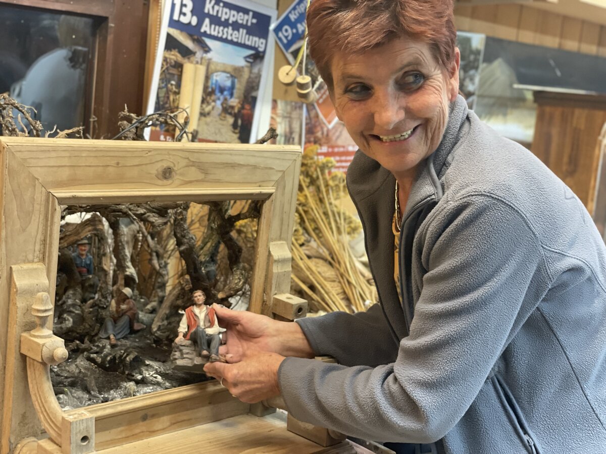Seit dem Jahr 2004, als sie ihre Mutter und ihre Schwester in Bad Goisern besuchte und das Krippenbauen für sich entdeckte, baut und gestaltet Liesi Krippen aller Art – und davon gibt es reichlich: Zunächst unterscheidet sie zwischen „orientalisch“ und „heimatlich“, und erklärt, dass erstere die christliche Weihnachtsgeschichte in Betlehem darstellen soll. Mit der Zeit adaptierten Schnitzer ihre alpenländische Heimat in die Krippen – so entstanden die „heimatlichen“, wo sich die Heilige Familie meist in einem Stall umgeben von Natur wiederfindet. In ihrer Werkstatt hat die Krippenbaumeisterin alles parat: Wurzelkrippen, Kastenkrippen, Laternenkrippen, Bilderkrippen – das sind Krippen in einer Art Bilderrahmen eingebaut, damit man sie aufhängen kann – und sogar Diorama-Krippen. Diorama bezeichnet eine besondere Bauart, bei der eine Szene in einen Schaukasten gebaut wird. Liesi beschreibt Diorama als „auf Perspektive gebaut“ – Man taucht also richtig in das Bild ein. Dafür malt Liesi auch die Hintergrundbilder selbst, etwa den Loser.