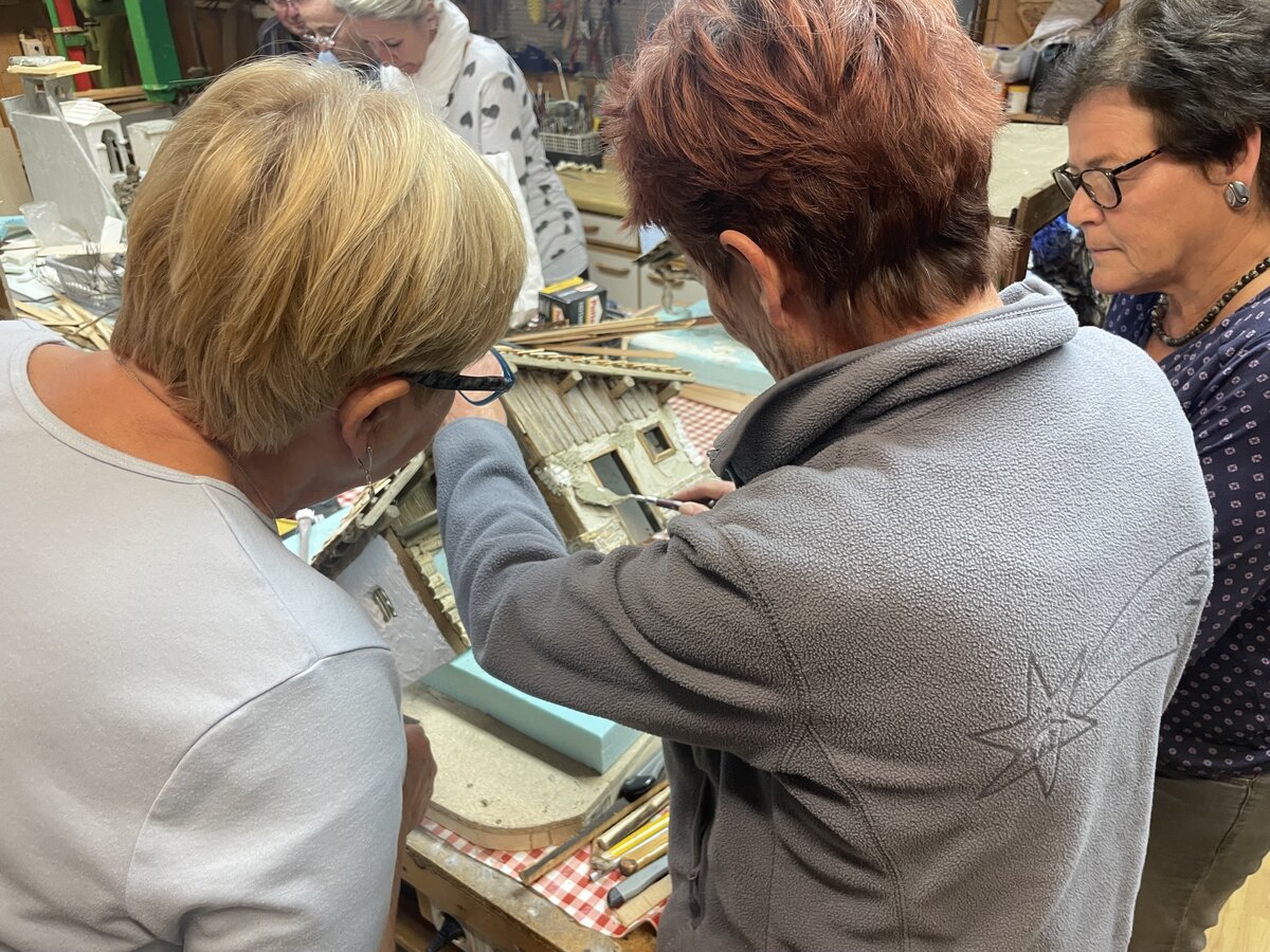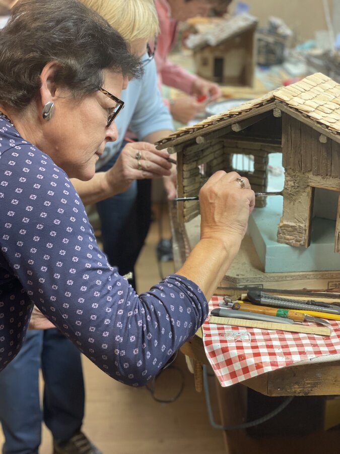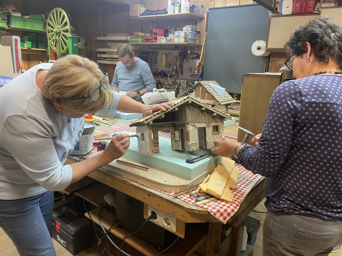Liesi hält seit 2007 auch Krippenbaukurse. Dabei können die Teilnehmerinnen entweder selbst eine Krippe bauen, oder die Gruppe arbeitet gemeinsam an einer Krippe. Insgesamt zwei Monate dauert ein Kurs bei ihr, in der Regel wird zweimal die Woche drei bis vier Stunden am Abend gearbeitet. „Alles beginnt mit der Grundplatte“, beschreibt die Ausseerin. Danach wird eine Weichfaserplatte zugeschnitten: Dafür wird der „Krippenmeter“ genommen, also genaue Maße, die eine Krippe braucht. Liesi erklärt: „Da gibt es genaue Angaben, für welche Größe von Figuren die Fenster und Türen ausgeschnitten werden müssen“. Anschließend verputzen und verschlagen die Krippenbauer diese. Die Dächer der Häuser und Ställe fertigen die Teilnehmer ebenfalls selbst in Feinarbeit an: So werden dafür etwa eigene Holzscheitel richtig zugeschnitten. „Das Allerwichtigste dabei ist das ‚Kante nehmen‘“, lacht Liesi, als sie mit Teilnehmerin Barbara darüber spricht. Es handelt sich stets um Naturholz, daher sei das ‚Kante nehmen‘, also der Feinschliff für die Ecken und Kanten des Holzes, essentiell. Als Liesi die Arbeiten an einer Krippe herzeigt und beschreibt, lacht sie wieder auf: „Das sind Eisstäbchen“, und deutet auf ein kleines Vordach einer orientalischen Krippe. Aus Lärchenrinde basteln sie etwa Ziegel für Dächer.