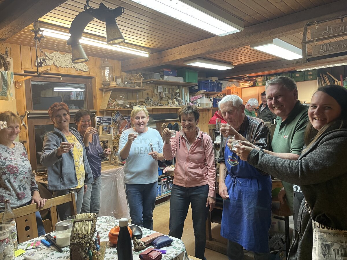 Der Krippenbaukurs ist bereits in vollem Gange, als es pünktlich um neun Uhr heißt: „Zeit für die Gloria!“ Bei dieser Tradition, erklären die Kursteilnehmerinnen, werde um neun Uhr eine Pause gemacht und mit einem klaren Schnaps auf den Abend angestoßen. Die Sache ist aber die: Stoßt man mit einem ‚Prost‘ anstelle von ‚Gloria‘ an, so muss man in der darauffolgenden Woche eine Flasche Schnaps zum Kurs mitnehmen. So will es der Brauch.