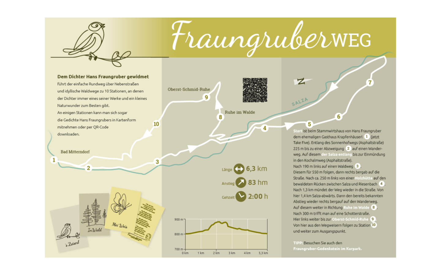 Der rund 6,4 km lange FraungruberWEG ist ein liebevoll gestalteter Themenweg, der dem Dichter Hans Fraungruber (1863–1933) gewidmet ist – einem Sohn Bad Mitterndorfs, der mit feinem Gespür für Sprache und Natur seine Heimat in Gedichten verewigte.