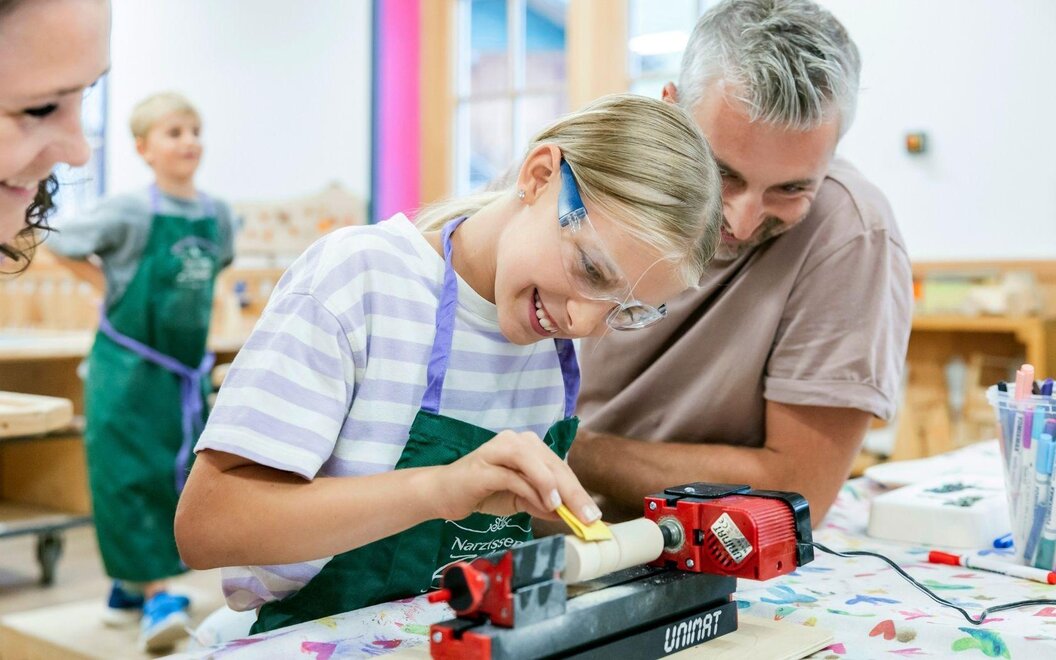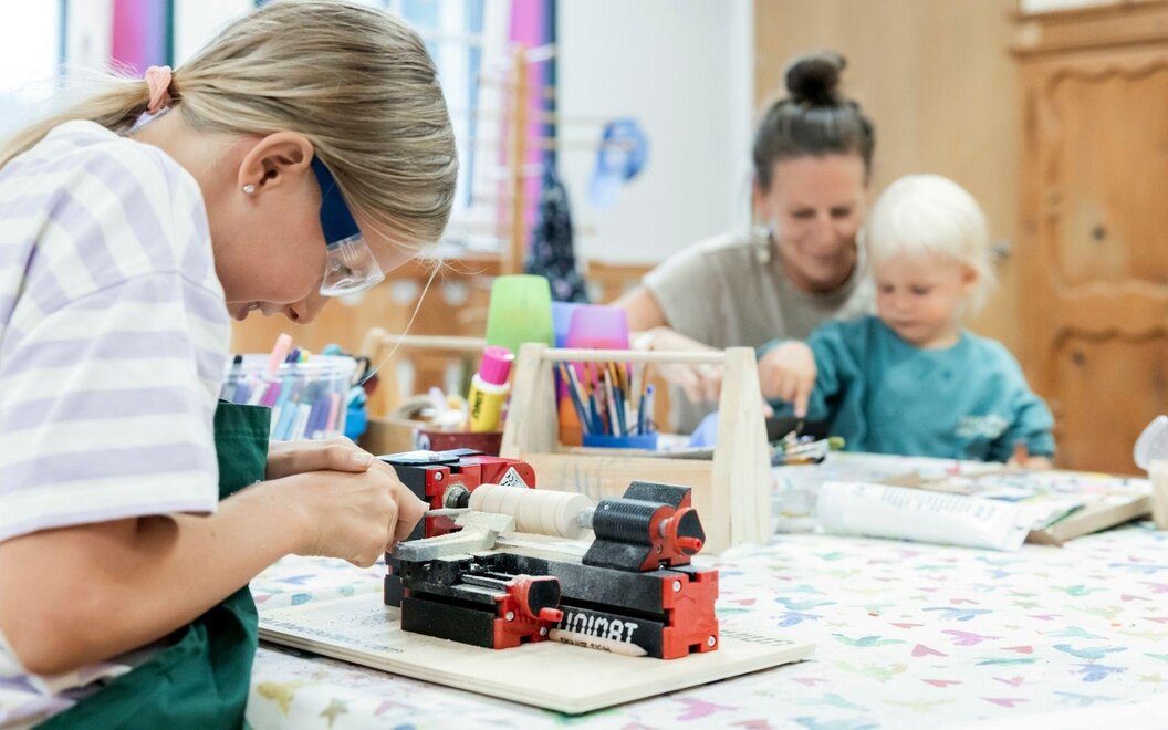 Ein Eierbecher für das Frühstücksei, eine Fantasiefigur oder ein Baum? Mit der Drechselmaschine Unimat 1 von Cool - Tools können Kinder und Jugendliche in der Holzwerkstatt Zloam ihre ersten Erfahrungen in der Holzbearbeitung sammeln.
