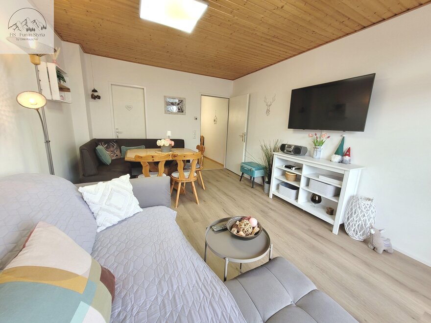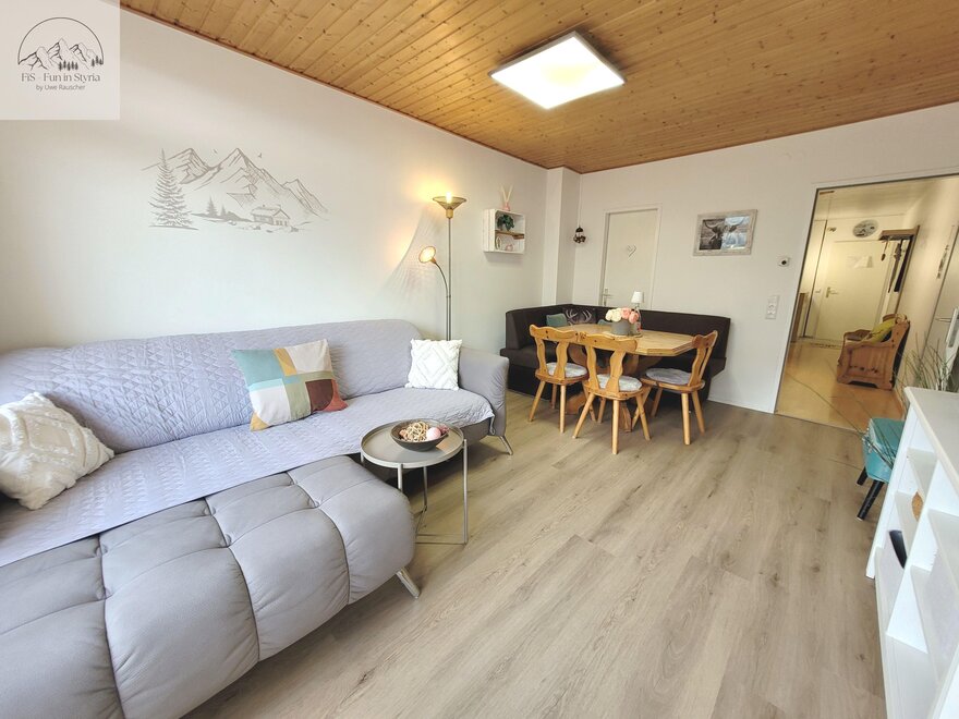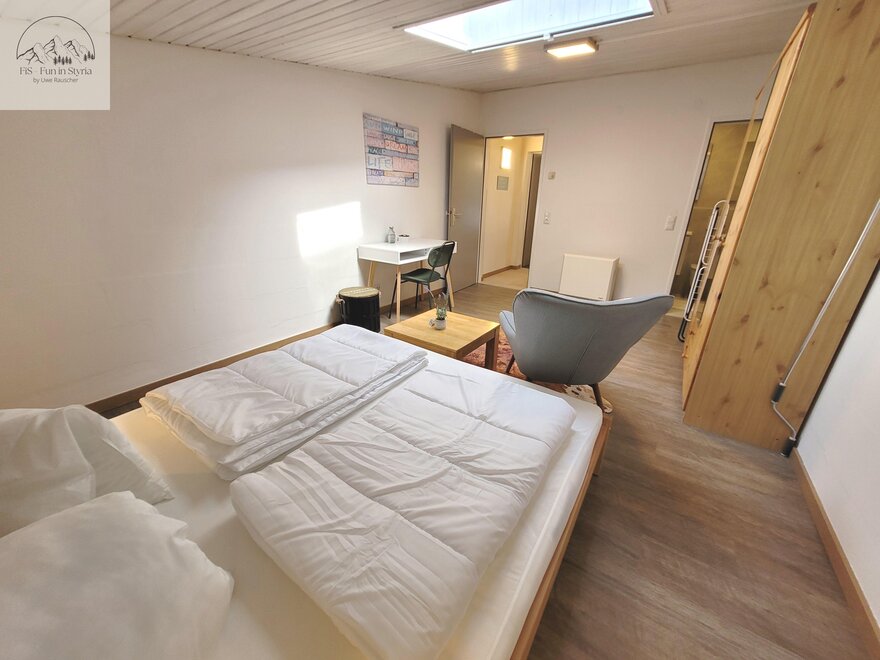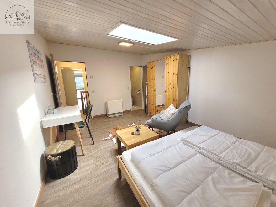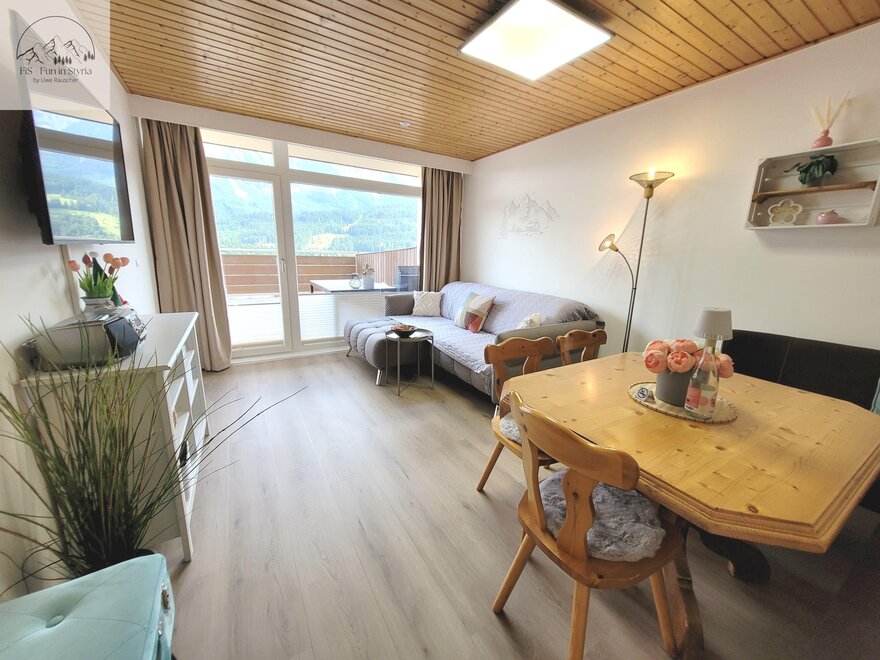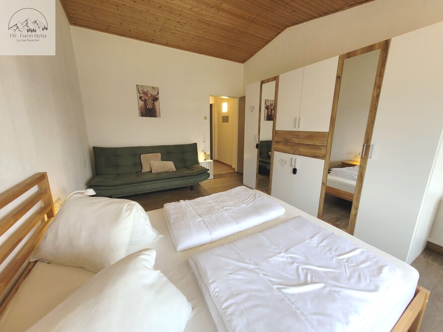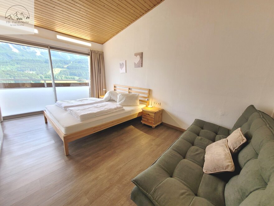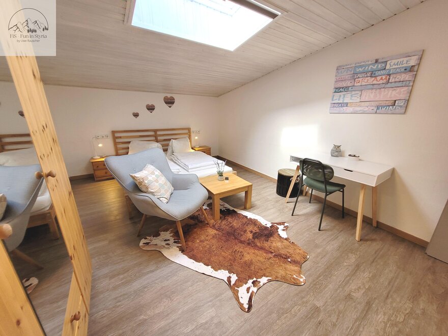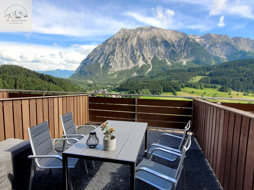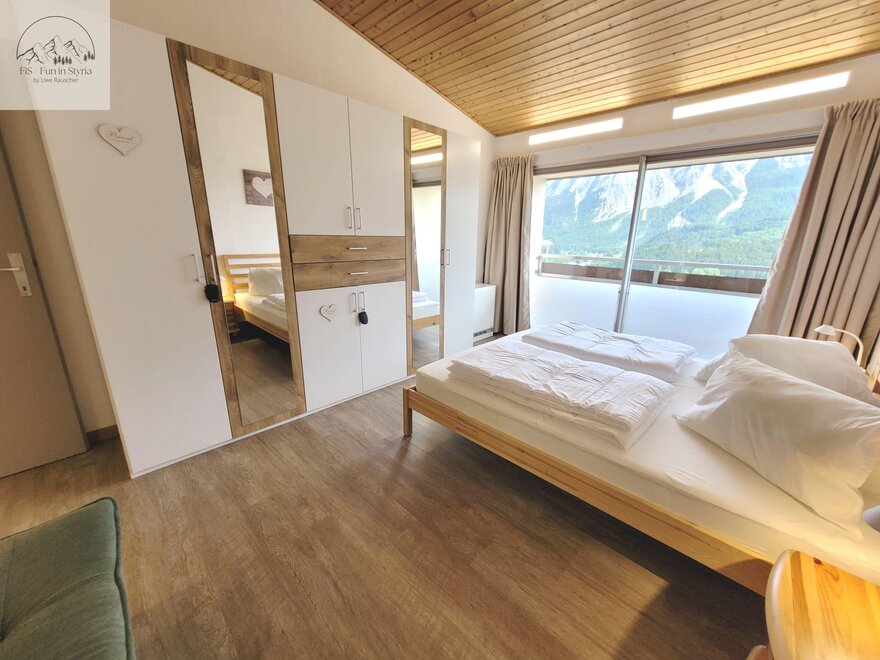 Das große und doppelstöckige 3-Raum-Appartement für bis zu 5 Erwachsenen oder 4 Erwachsenen und 2 Kindern erwartet Sie im Kulmhof in Tauplitz mit einem wunderschönen Panoramablick vom 5. Stockwerk über das Hinterbergertal und den majestätischen Grimming.