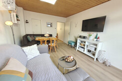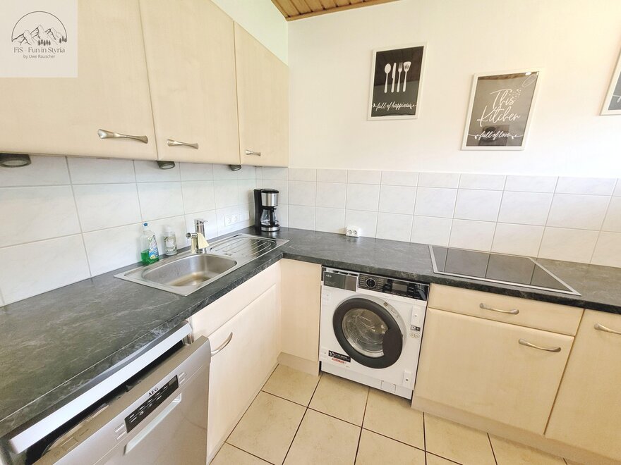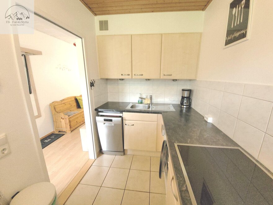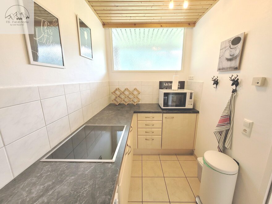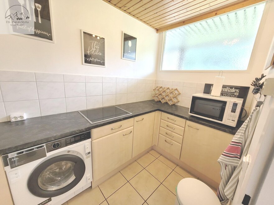 Untergeschoß: Diele mit Garderobe; Wohnraum mit großer Couch und großer Essecke; Separate Küche inkl. Mikrowelle, Herd mit 4 Platten, Kühlschrank, Kaffeemaschine, Wasserkocher etc., sowie einem Waschtrockner; Badezimmer mit Dusche/WC und Fön; großer Balkon mit herrlichem Ausblick