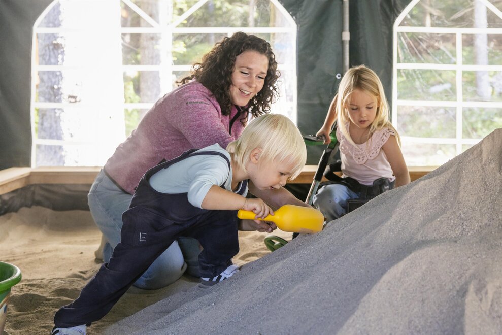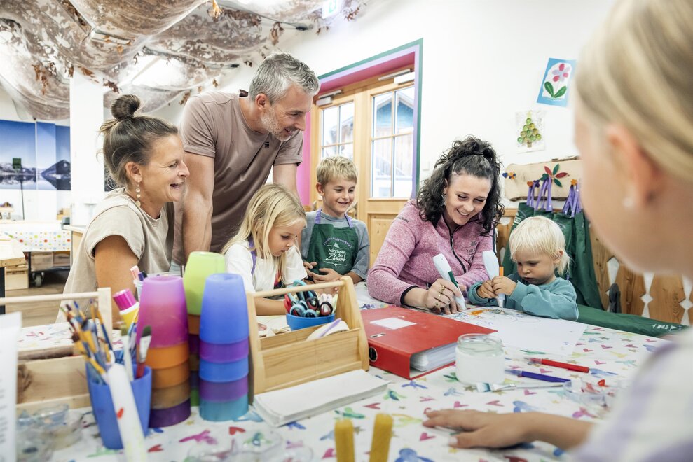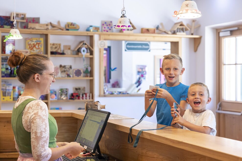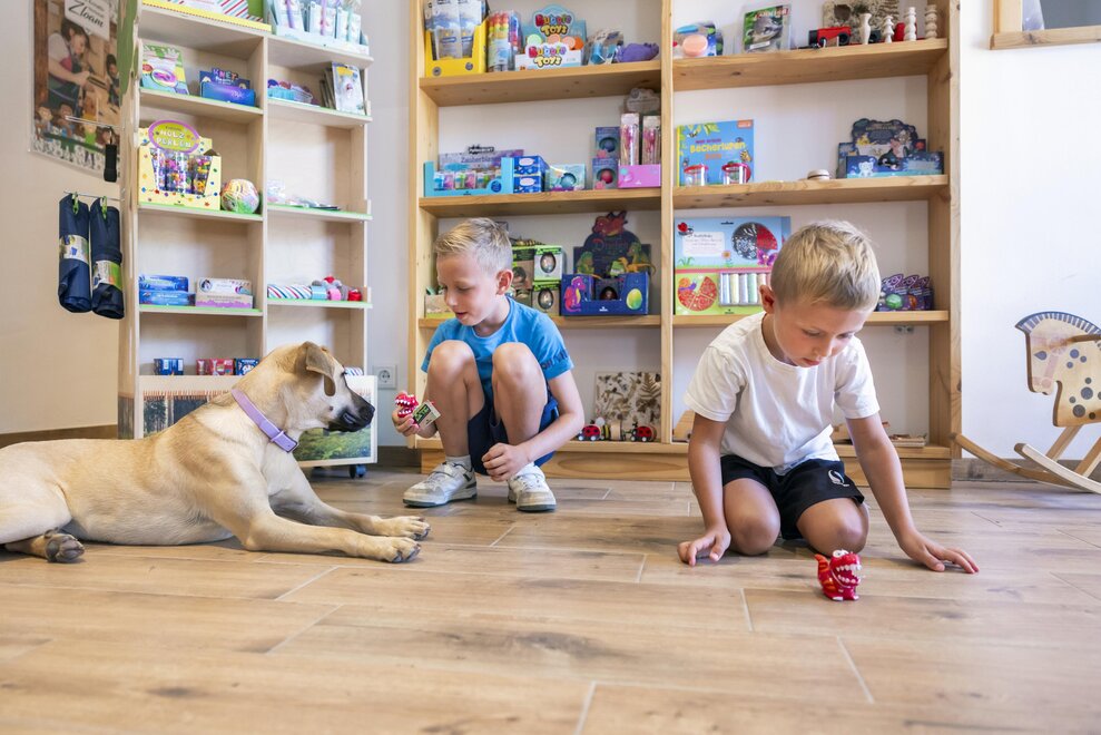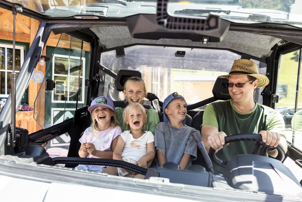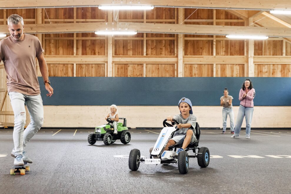 Kinder freuen sich über den Erlebnisspielplatz mit Hupfburg, den Indoor Kinderfuhrpark und kreative Familienangebote im umfangreichen Wochenprogramm.