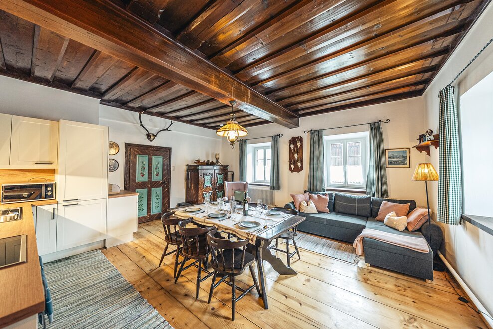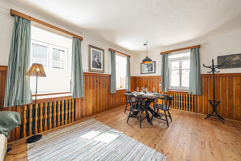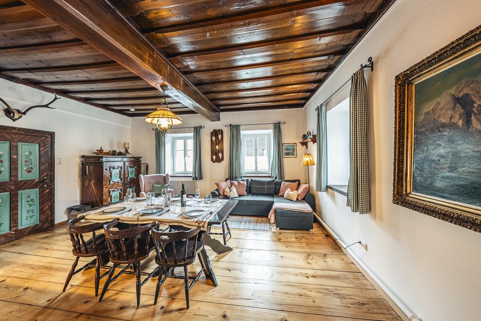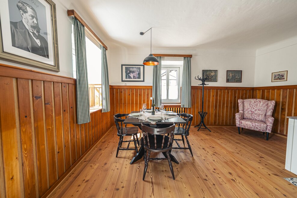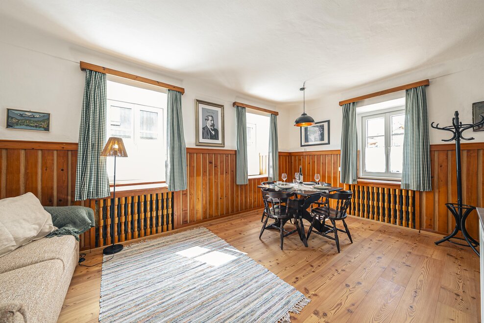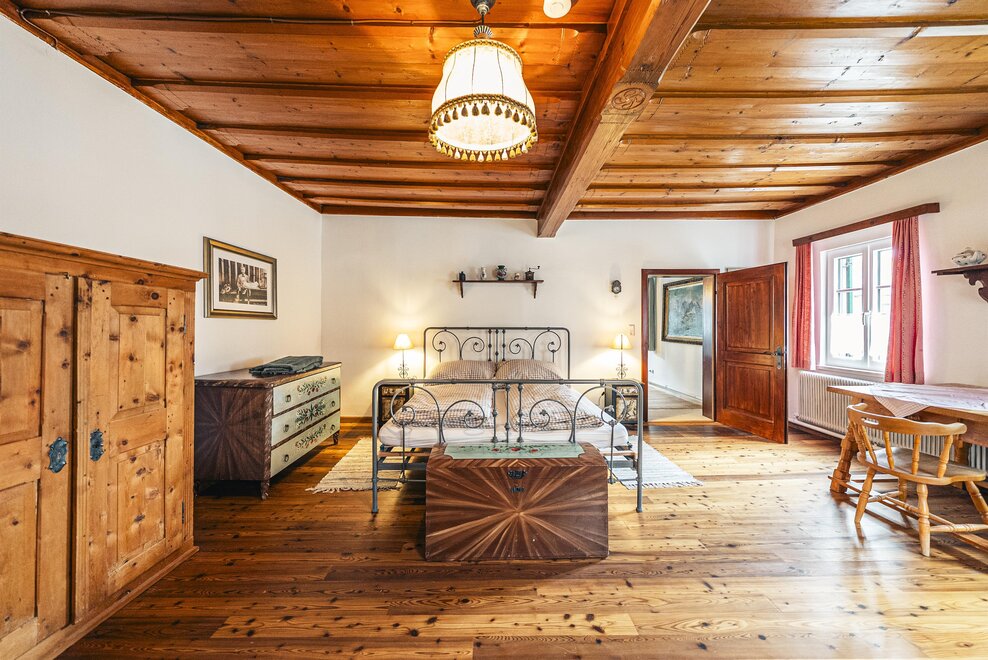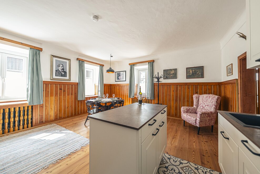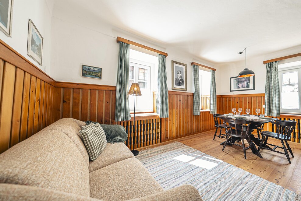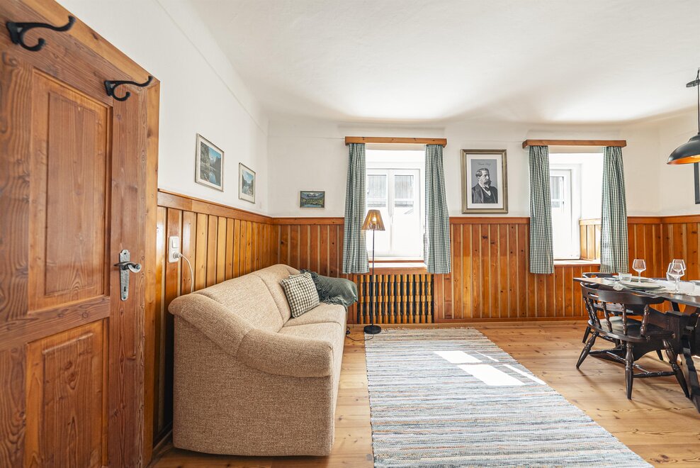 Die Richard Strauss Suite ist das größte, im ersten Stock gelegene Appartement im SIEGLGUT. Die 2-Zimmer Suite wurde neu renoviert und ist mit einer großen Küche im süd-westlichen Wohn-/Essraum und einem geräumigen Bad/WC Richtung Loser ausgestattet. Im großen Schlafraum steht ein Doppelbett und ein ausziehbares Sofa für weitere 2 Personen zur Verfügung. Im Wohn-/Essraum befindet sich die neue Küche, ein geräumiger Esstisch und ein gemütliches Sofa, das zum Verweilen einlädt. Die herrlichen alten Holzdecken und -böden und die herrschaftliche Einrichtung strahlen den besonderen Flair unseres alten Gutsgebäudes aus. Ideal auch für Familien (2 Erwachsene plus 2 Kinder) oder Pärchen, die es räumlich großzügiger lieben.