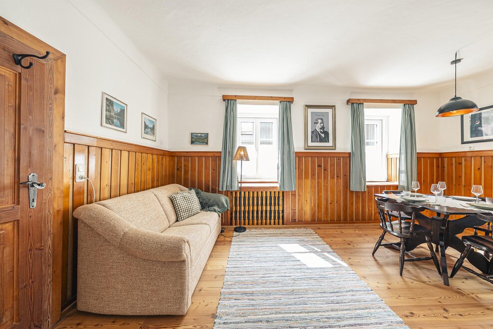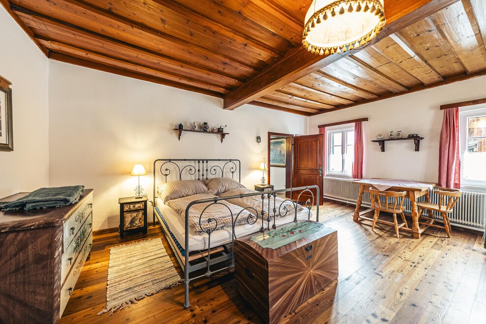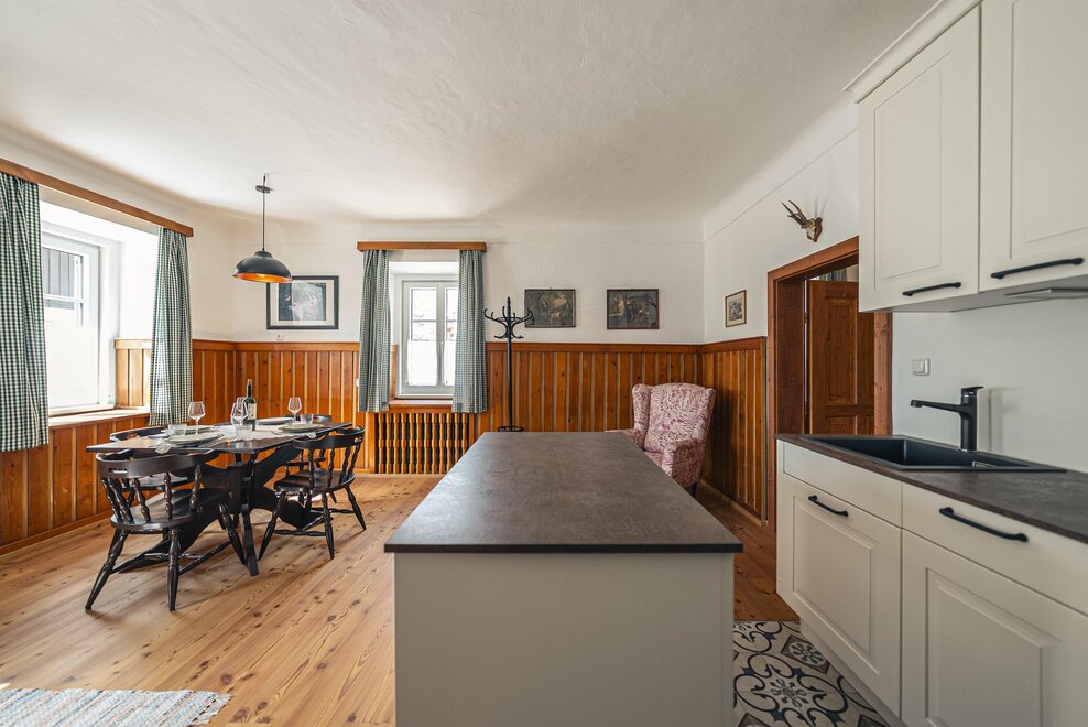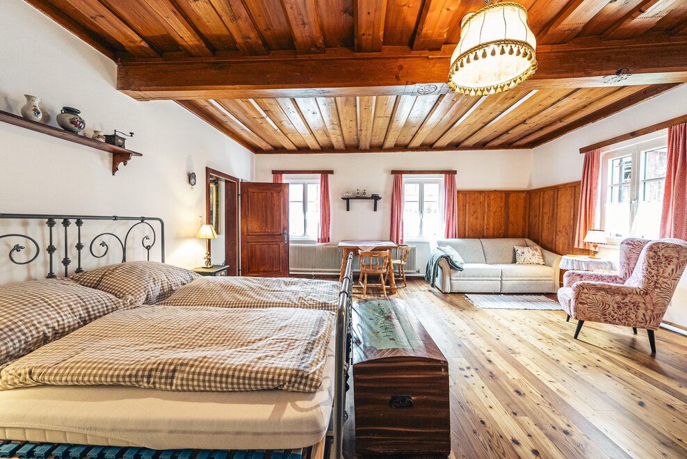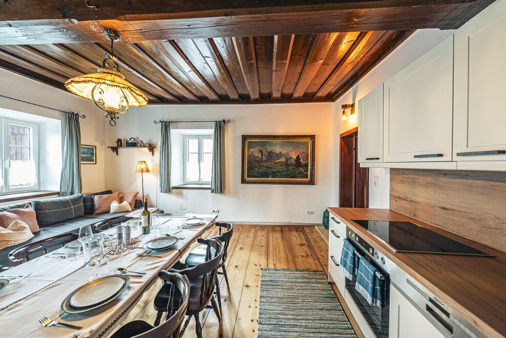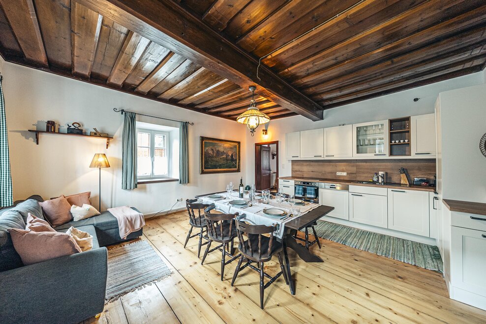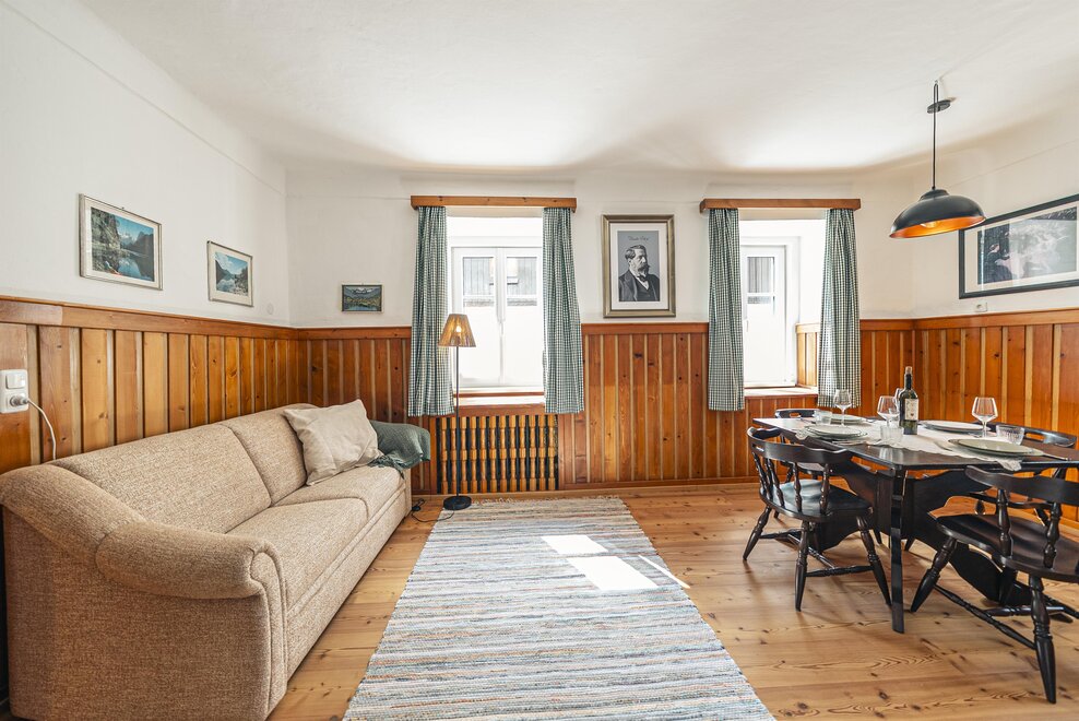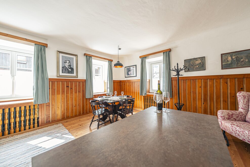 Die Richard Strauss Suite ist das größte, im ersten Stock gelegene Appartement im SIEGLGUT. Die 2-Zimmer Suite wurde neu renoviert und ist mit einer großen Küche im süd-westlichen Wohn-/Essraum und einem geräumigen Bad/WC Richtung Loser ausgestattet. Im großen Schlafraum steht ein Doppelbett und ein ausziehbares Sofa für weitere 2 Personen zur Verfügung. Im Wohn-/Essraum befindet sich die neue Küche, ein geräumiger Esstisch und ein gemütliches Sofa, das zum Verweilen einlädt. Die herrlichen alten Holzdecken und -böden und die herrschaftliche Einrichtung strahlen den besonderen Flair unseres alten Gutsgebäudes aus. Ideal auch für Familien (2 Erwachsene plus 2 Kinder) oder Pärchen, die es räumlich großzügiger lieben.