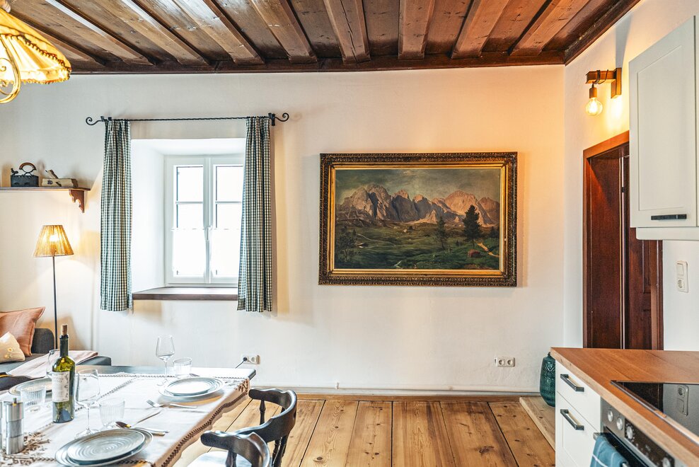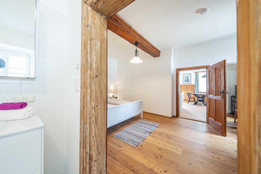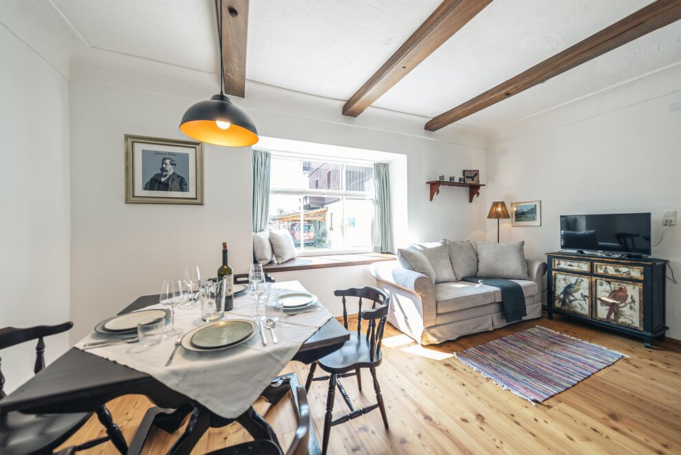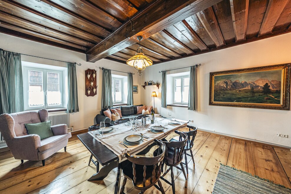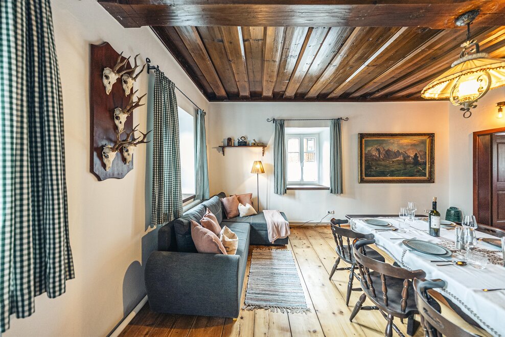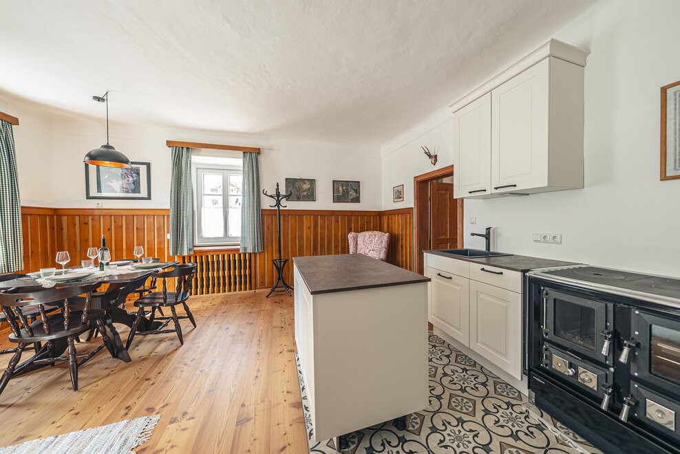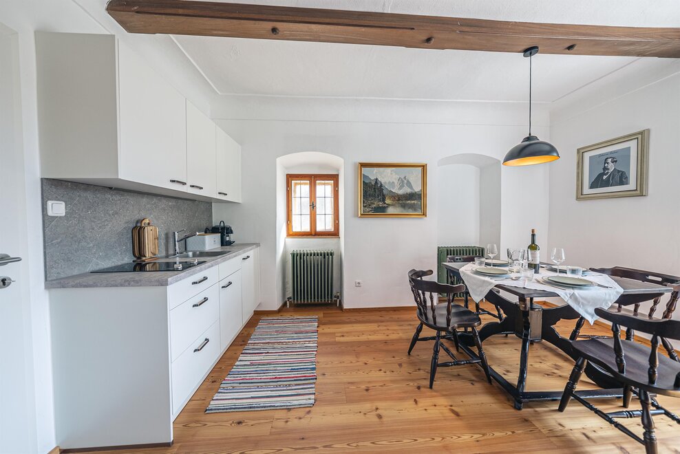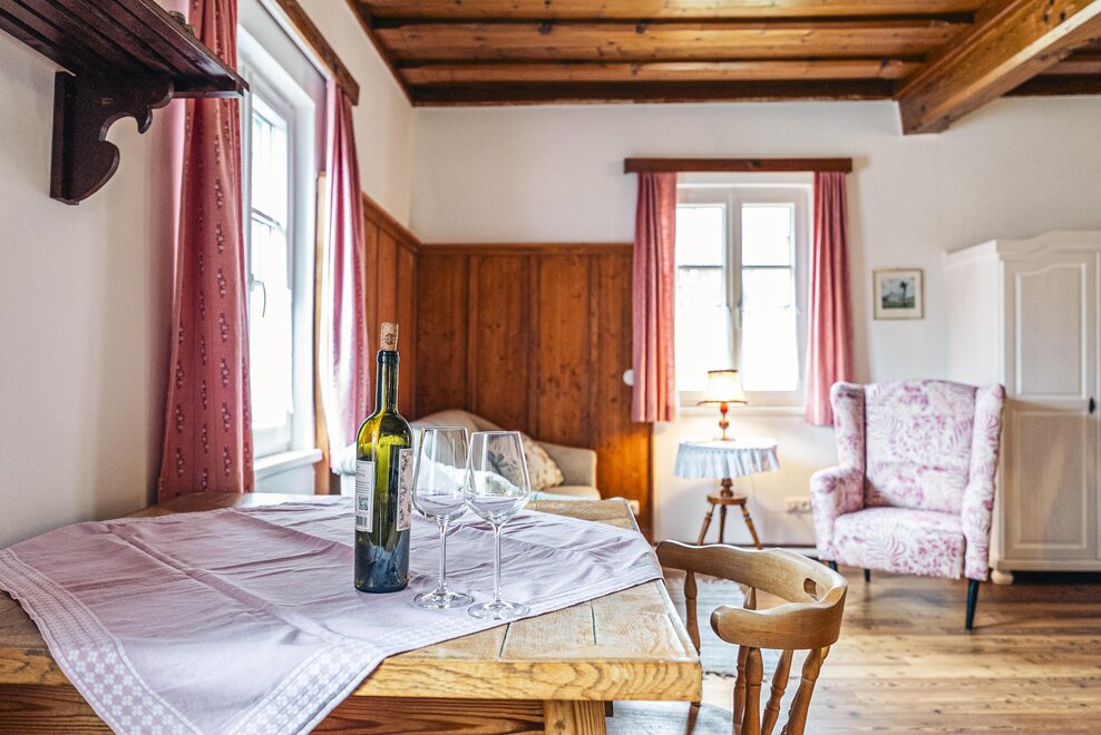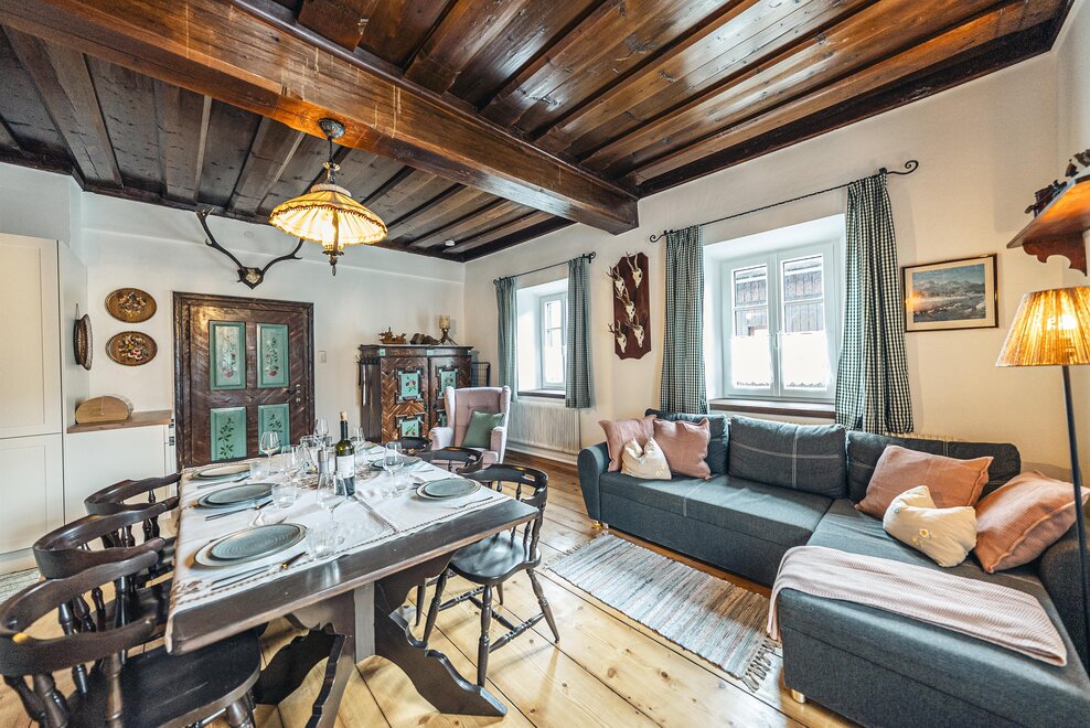 Die Richard Strauss Suite ist das größte, im ersten Stock gelegene Appartement im SIEGLGUT. Die 2-Zimmer Suite wurde neu renoviert und ist mit einer großen Küche im süd-westlichen Wohn-/Essraum und einem geräumigen Bad/WC Richtung Loser ausgestattet. Im großen Schlafraum steht ein Doppelbett und ein ausziehbares Sofa für weitere 2 Personen zur Verfügung. Im Wohn-/Essraum befindet sich die neue Küche, ein geräumiger Esstisch und ein gemütliches Sofa, das zum Verweilen einlädt. Die herrlichen alten Holzdecken und -böden und die herrschaftliche Einrichtung strahlen den besonderen Flair unseres alten Gutsgebäudes aus. Ideal auch für Familien (2 Erwachsene plus 2 Kinder) oder Pärchen, die es räumlich großzügiger lieben.
