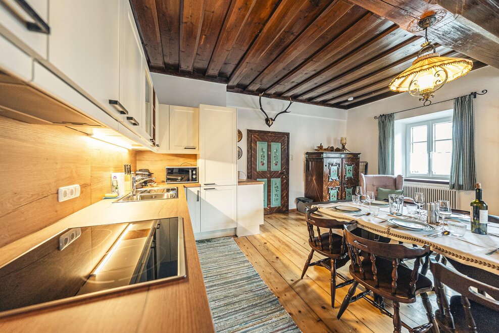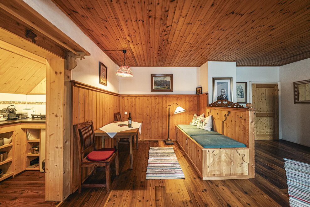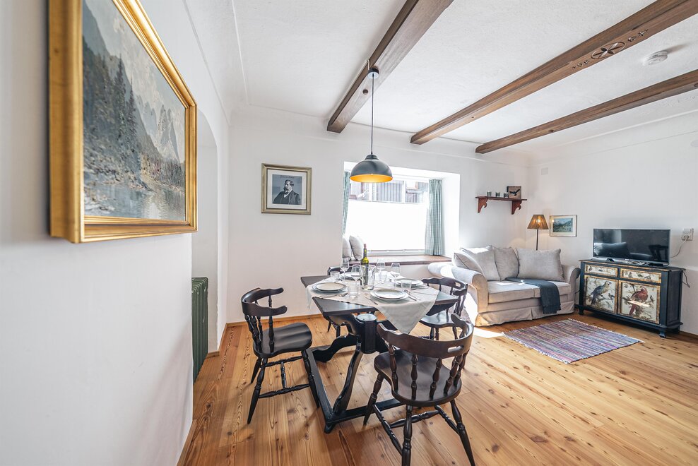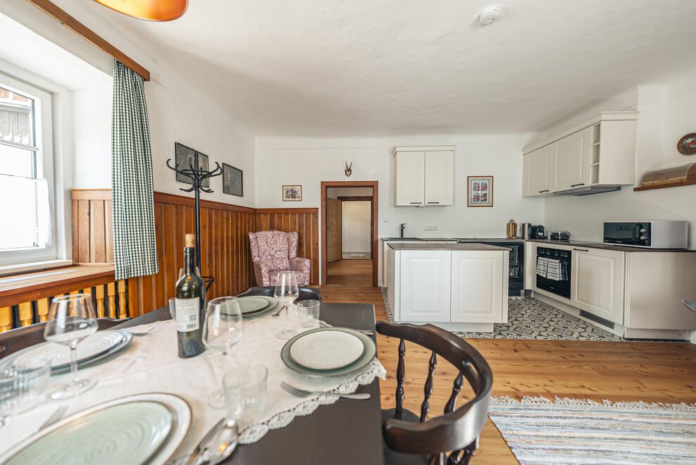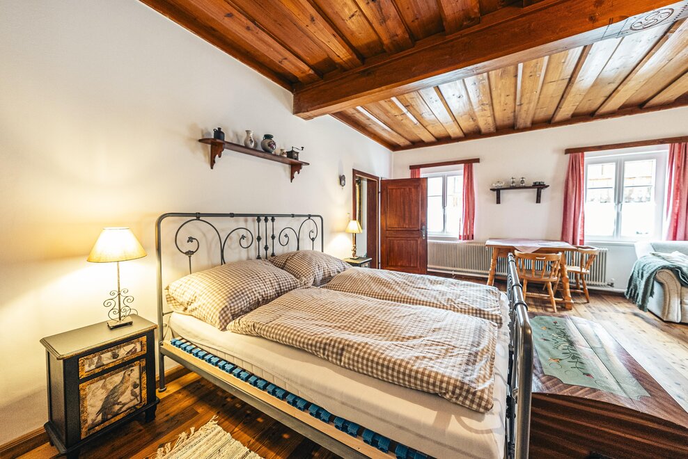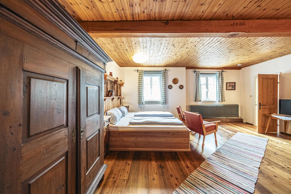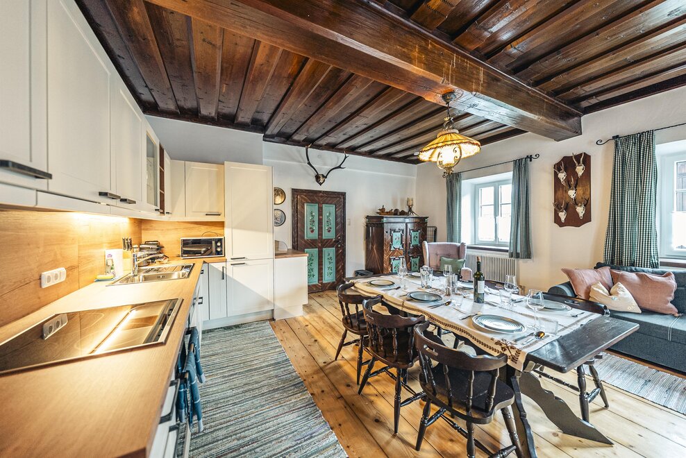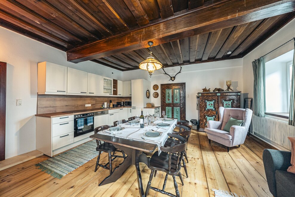 Die Richard Strauss Suite ist das größte, im ersten Stock gelegene Appartement im SIEGLGUT. Die 2-Zimmer Suite wurde neu renoviert und ist mit einer großen Küche im süd-westlichen Wohn-/Essraum und einem geräumigen Bad/WC Richtung Loser ausgestattet. Im großen Schlafraum steht ein Doppelbett und ein ausziehbares Sofa für weitere 2 Personen zur Verfügung. Im Wohn-/Essraum befindet sich die neue Küche, ein geräumiger Esstisch und ein gemütliches Sofa, das zum Verweilen einlädt. Die herrlichen alten Holzdecken und -böden und die herrschaftliche Einrichtung strahlen den besonderen Flair unseres alten Gutsgebäudes aus. Ideal auch für Familien (2 Erwachsene plus 2 Kinder) oder Pärchen, die es räumlich großzügiger lieben.
