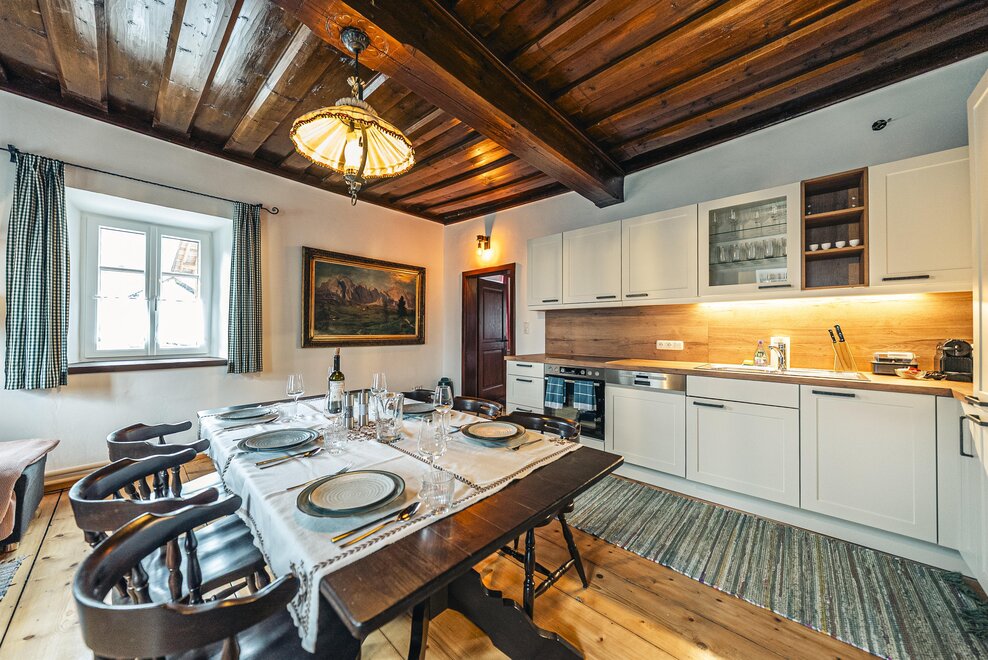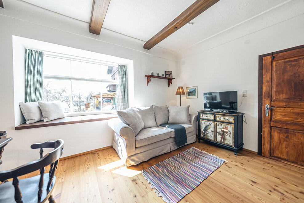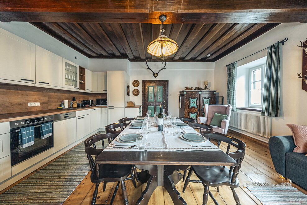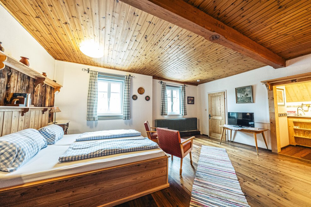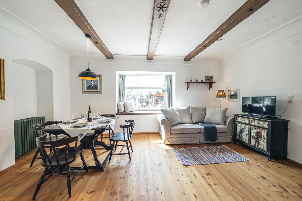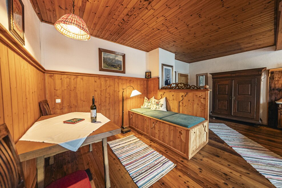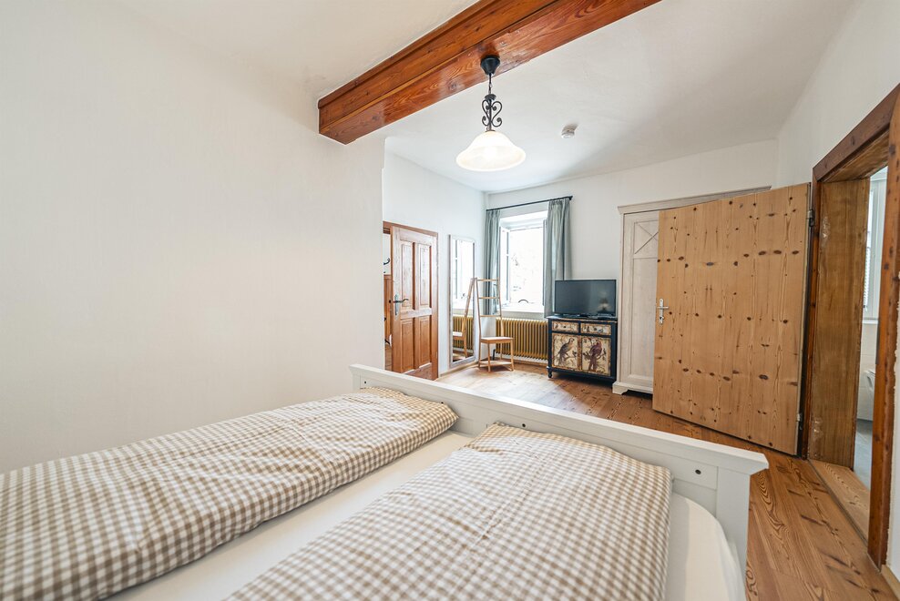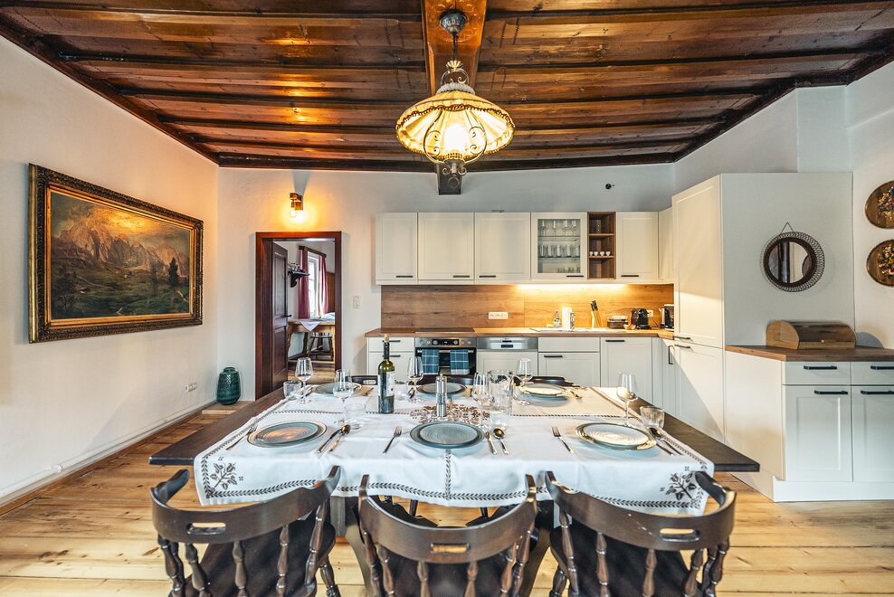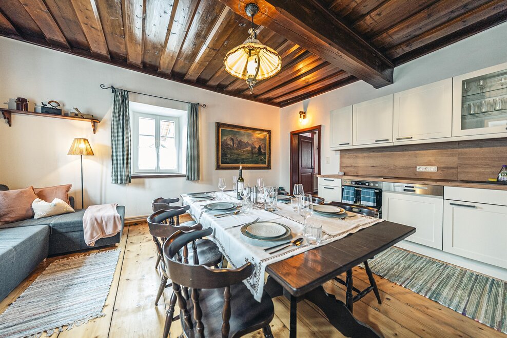 Die Richard Strauss Suite ist das größte, im ersten Stock gelegene Appartement im SIEGLGUT. Die 2-Zimmer Suite wurde neu renoviert und ist mit einer großen Küche im süd-westlichen Wohn-/Essraum und einem geräumigen Bad/WC Richtung Loser ausgestattet. Im großen Schlafraum steht ein Doppelbett und ein ausziehbares Sofa für weitere 2 Personen zur Verfügung. Im Wohn-/Essraum befindet sich die neue Küche, ein geräumiger Esstisch und ein gemütliches Sofa, das zum Verweilen einlädt. Die herrlichen alten Holzdecken und -böden und die herrschaftliche Einrichtung strahlen den besonderen Flair unseres alten Gutsgebäudes aus. Ideal auch für Familien (2 Erwachsene plus 2 Kinder) oder Pärchen, die es räumlich großzügiger lieben.