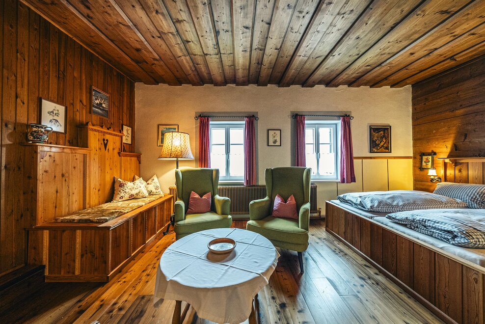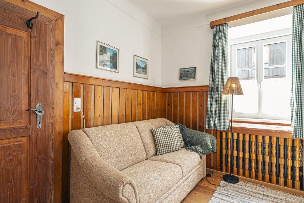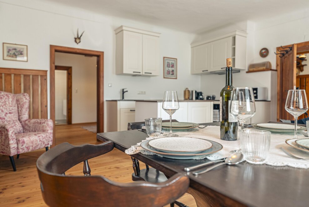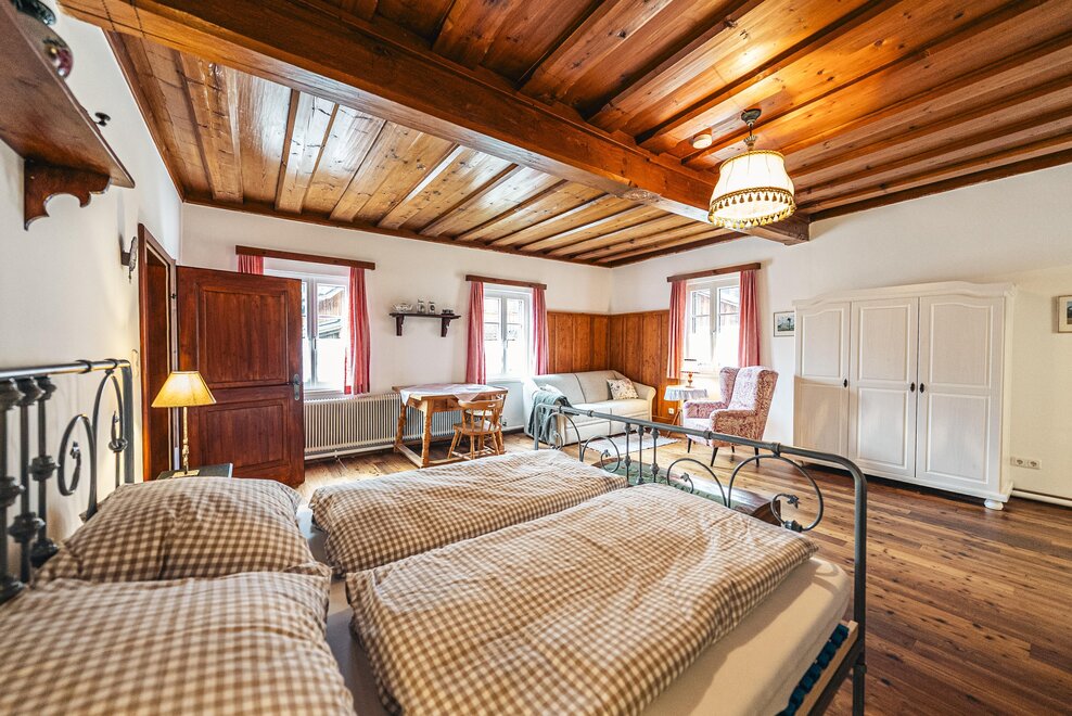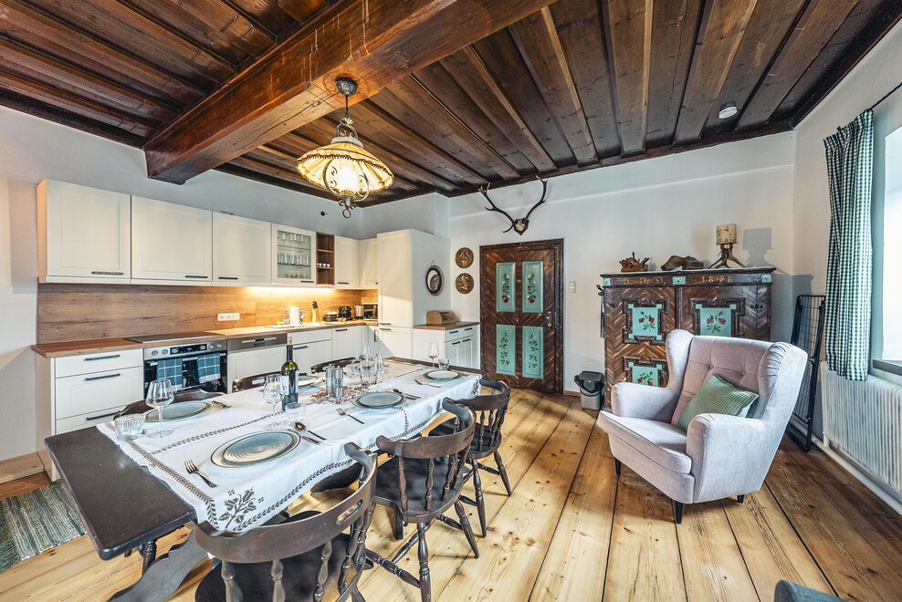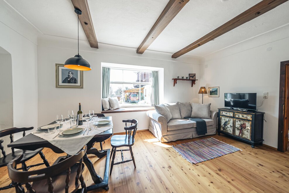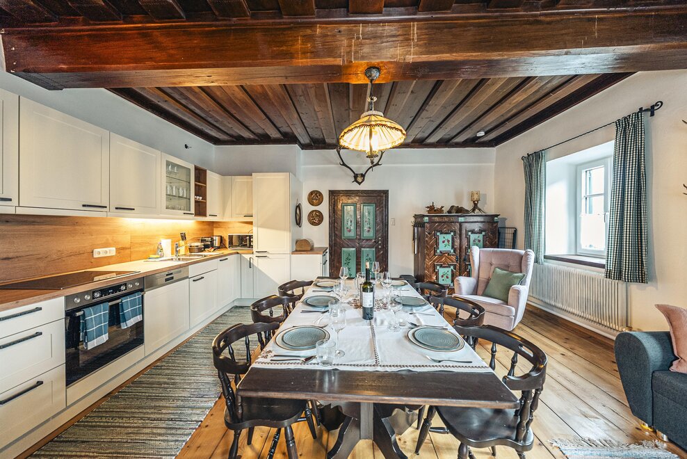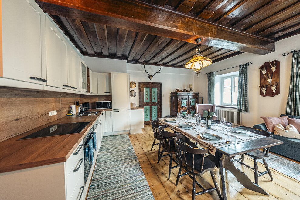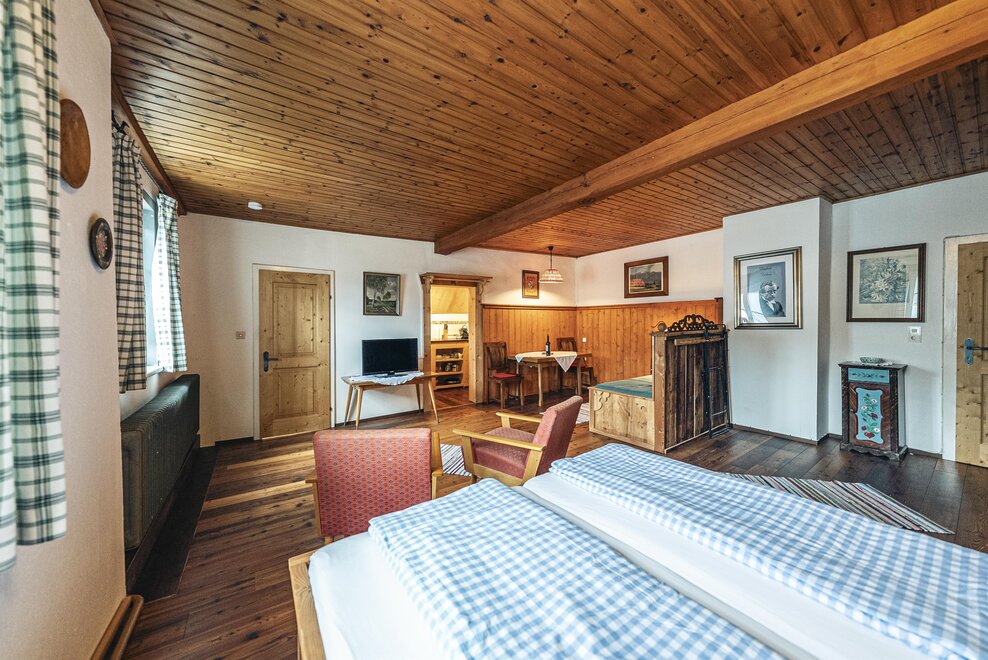 Die Richard Strauss Suite ist das größte, im ersten Stock gelegene Appartement im SIEGLGUT. Die 2-Zimmer Suite wurde neu renoviert und ist mit einer großen Küche im süd-westlichen Wohn-/Essraum und einem geräumigen Bad/WC Richtung Loser ausgestattet. Im großen Schlafraum steht ein Doppelbett und ein ausziehbares Sofa für weitere 2 Personen zur Verfügung. Im Wohn-/Essraum befindet sich die neue Küche, ein geräumiger Esstisch und ein gemütliches Sofa, das zum Verweilen einlädt. Die herrlichen alten Holzdecken und -böden und die herrschaftliche Einrichtung strahlen den besonderen Flair unseres alten Gutsgebäudes aus. Ideal auch für Familien (2 Erwachsene plus 2 Kinder) oder Pärchen, die es räumlich großzügiger lieben.