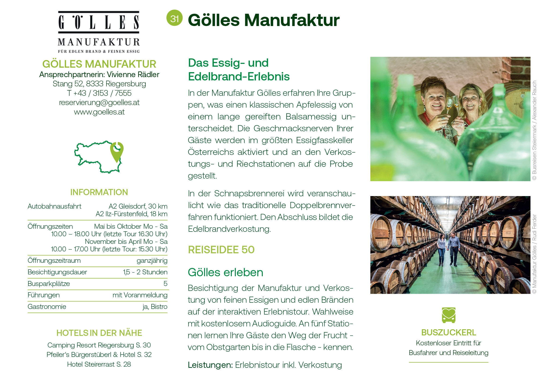 In der Manufaktur Gölles erfahren Ihre Gruppen, was einen klassischen Apfelessig von einem lange gereiften Balsamessig unterscheidet. Die Geschmacksnerven Ihrer Gäste werden im größten Essigfasskeller Österreichs aktiviert und an den Verkostungs- und Riechstationen auf die Probe gestellt. In der Schnapsbrennerei wird veranschaulicht wie das traditionelle Doppelbrennverfahren funktioniert. Den Abschluss bildet die Edelbrandverkostung.