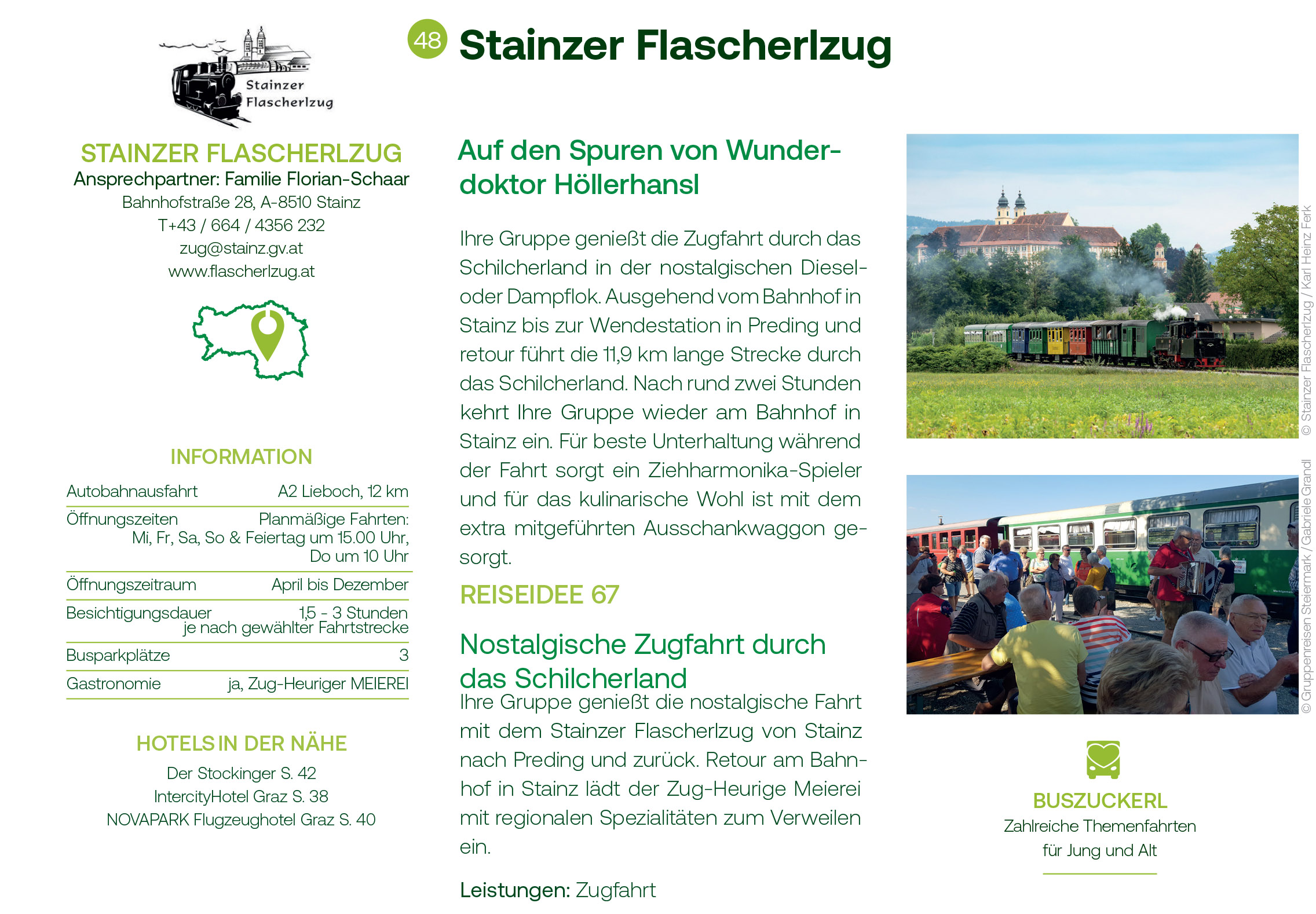 Ihre Gruppe genießt die Zugfahrt durch das Schilcherland in der nostalgischen Diesel- oder Dampflok. Ausgehend vom Bahnhof in Stainz bis zur Wendestation in Preding und retour führt die 11,9 km lange Strecke durch das Schilcherland. Nach rund zwei Stunden kehrt Ihre Gruppe wieder am Bahnhof in Stainz ein. Für beste Unterhaltung während der Fahrt sorgt ein Ziehharmonika-Spieler und für das kulinarische Wohl ist mit dem extra mitgeführten Ausschankwaggon gesorgt.