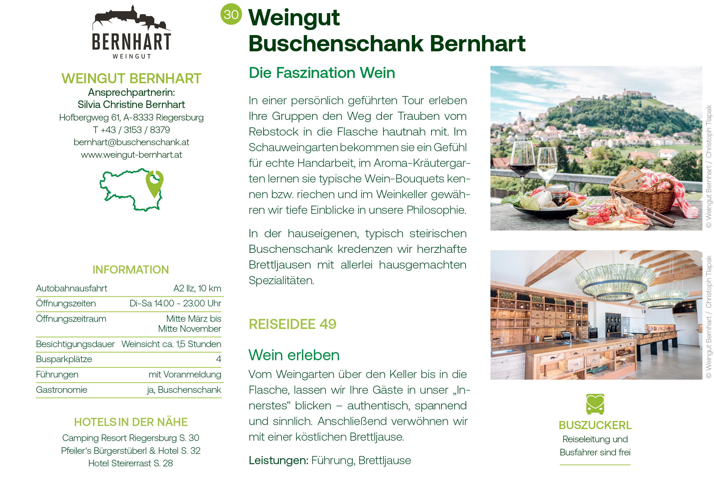 In einer persönlich geführten Tour erleben Ihre Gruppen den Weg der Trauben vom Rebstock in die Flasche hautnah mit. Im Schauweingarten bekommen sie ein Gefühl für echte Handarbeit, im Aroma-Kräutergarten lernen sie typische Wein-Bouquets kennen bzw. riechen und im Weinkeller gewähren wir tiefe Einblicke in unsere Philosophie. In der hauseigenen, typisch steirischen Buschenschank kredenzen wir herzhafte Brettljausen mit allerlei hausgemachten Spezialitäten.