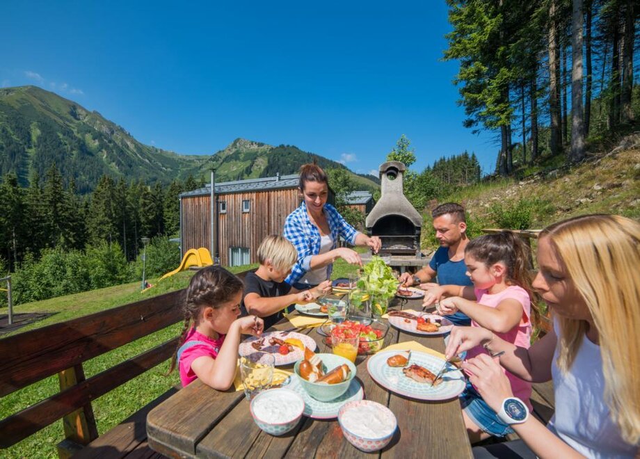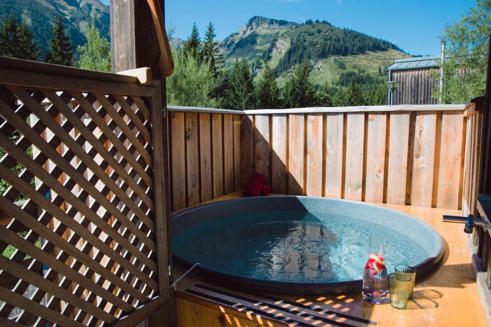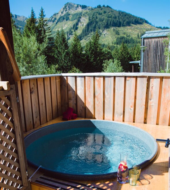 Hot Pot: Nach einem ausgiebigen Wandertag im Sommer oder aufregenden Schitag im Winter sorgt der HOT POT auf den Terrassen der beiden HüttePlus Hütten für heißen Badespass im Holzfass.