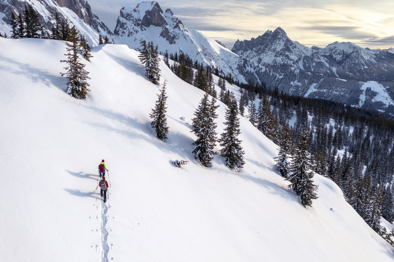 Das Gesäuse muss man sich erarbeiten, gerade auch im Winter. Wer hoch hinaus will, der muss gehen. Aber nicht zwingend auf Fellen. Der Nicht-Skifahrer ist nicht zum Tal-Dasein verdammt. Er kann sich das Gebirge ergehen, freilich nicht in Bergschuhen, sondern in Schneeschuhen. Und ist dabei weit weniger abhängig von gutem Schnee als der Skitourengeher: Ob Pulver oder Harsch, das ist dem Schneeschuhwanderer einerlei. Schneeschuhkrallen sei Dank!