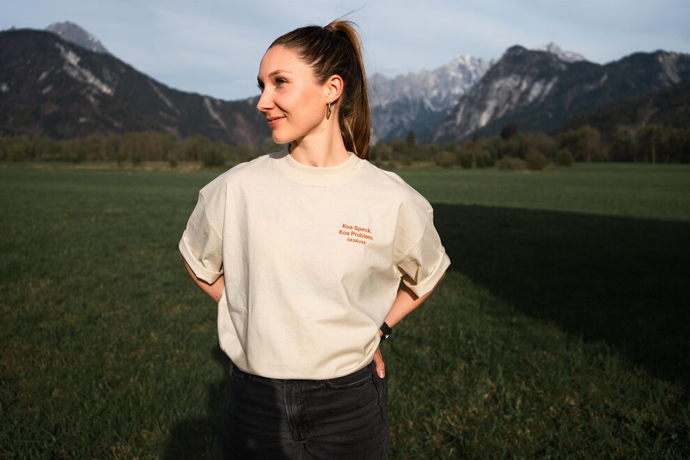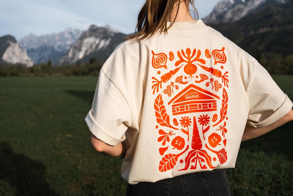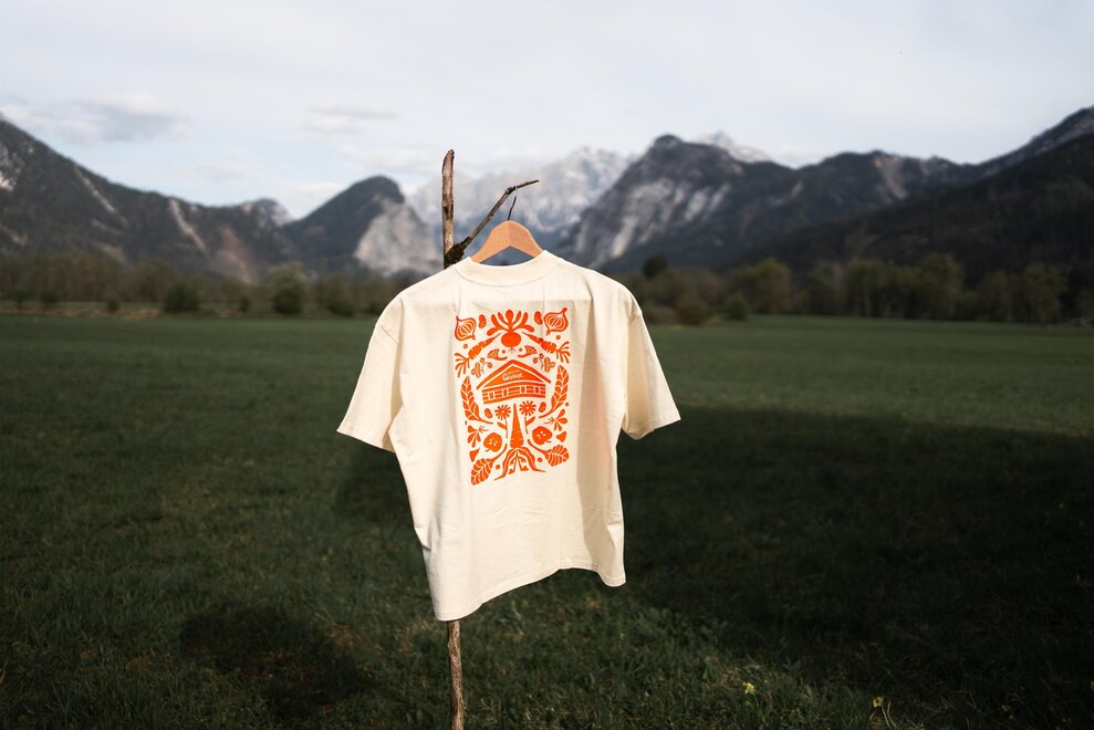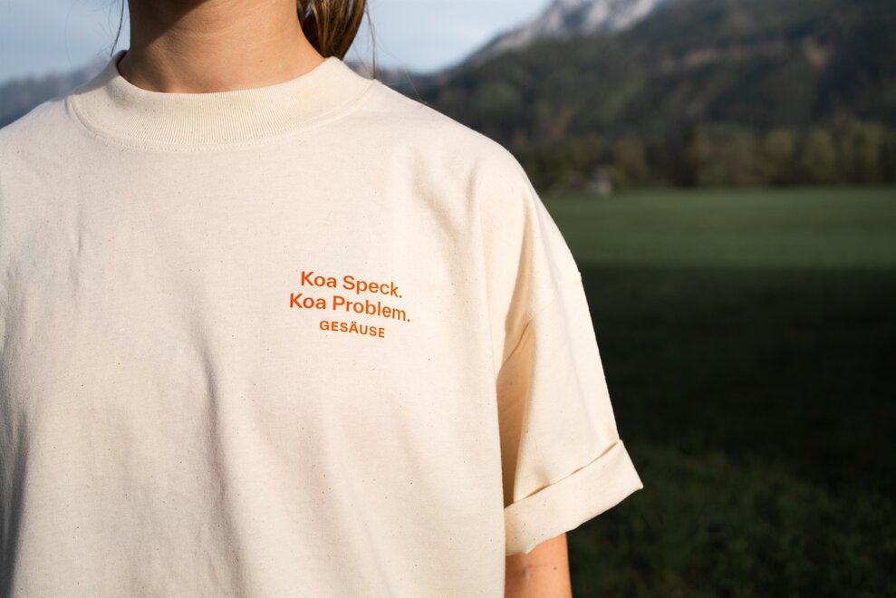 Das Shirt zur Hüttenrunde – Vegan Edition ist Teil der neuen Gesäuse-Kollektion. Mit orangefarbener Illustration am Rücken: Hütte, Wurzeln, Zwiebelblüten – klar, reduziert, kraftvoll. Dazu eine eindeutige Botschaft: Koa Speck. Koa Problem. Gedruckt auf hochwertiger Bio-Baumwolle. Oversized, unisex, angenehm zu tragen.