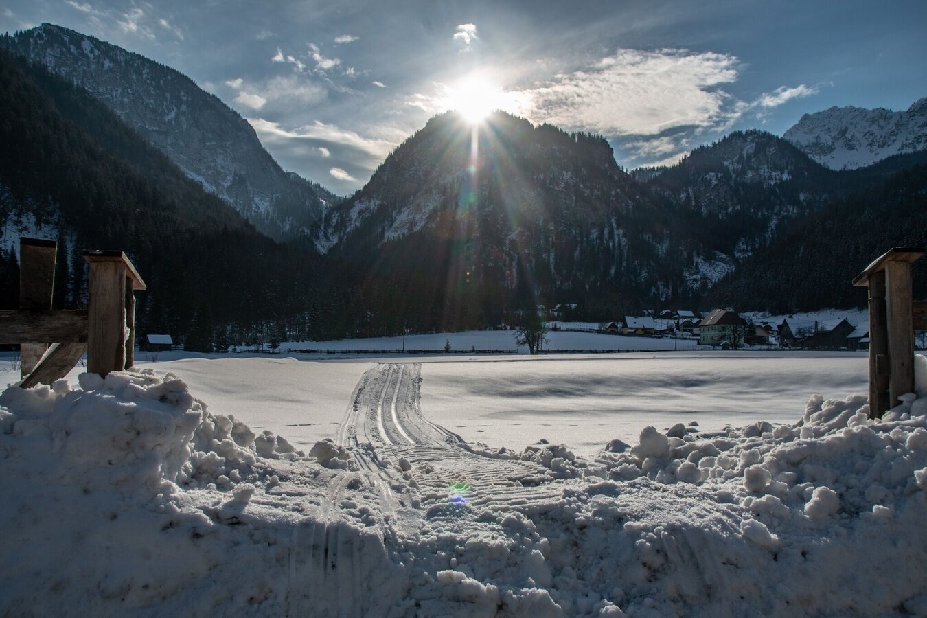 Bei guter Schneelage führt die Panoramaloipe über schmälere Pfade mit einigen Höhenmetern in Klassisch und Skating über die sonnenreiche Seite, vorbei an kleinen Hütten und immer wieder mit Anschluss an den Talboden.