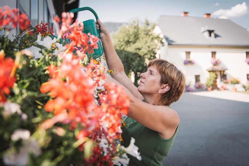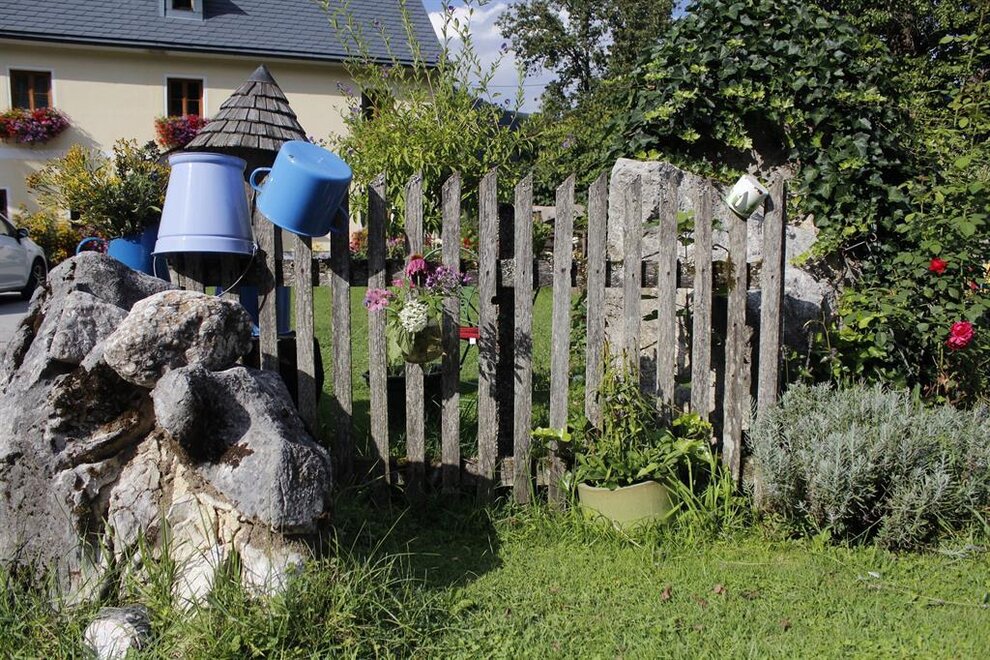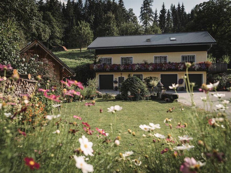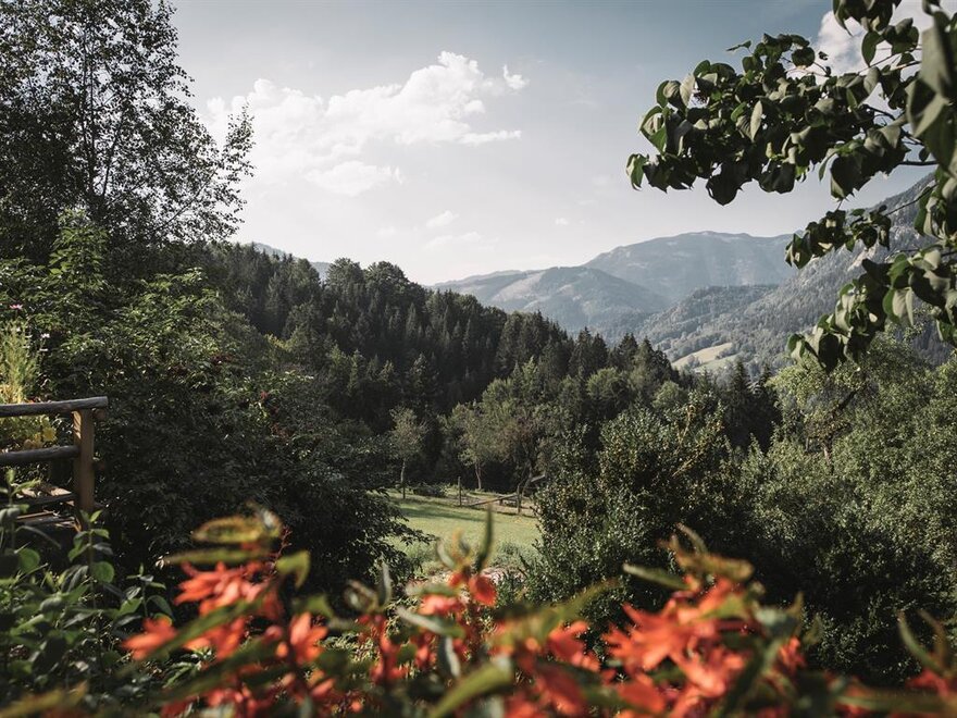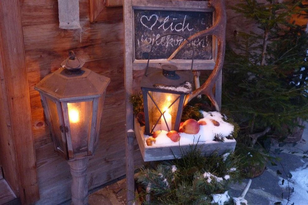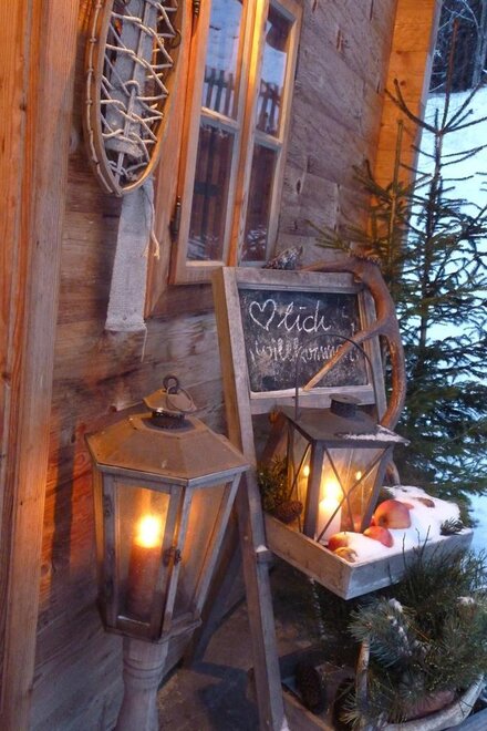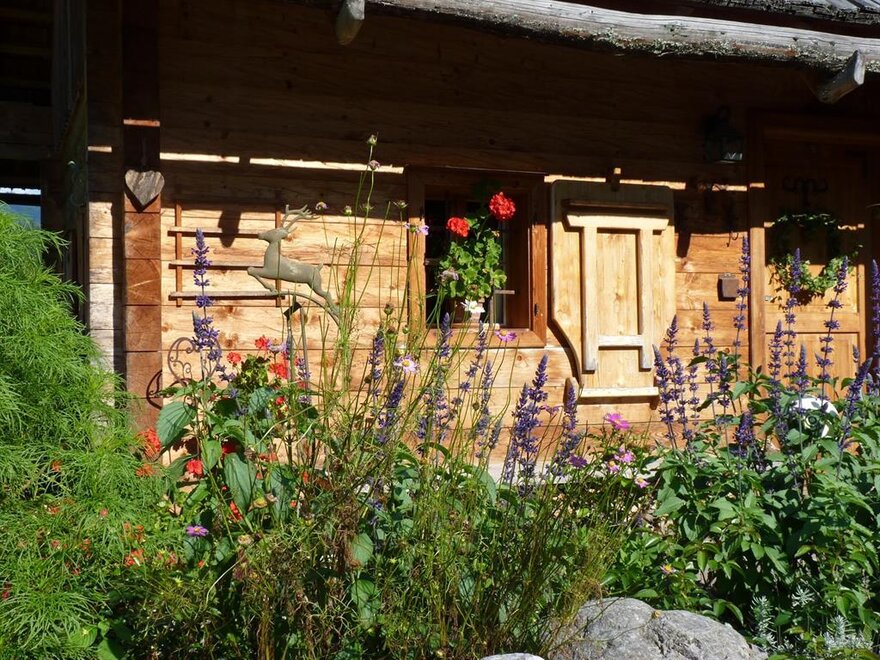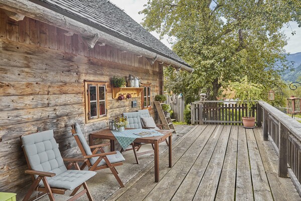Eine große Lärchenterrasse mit schönen Gartenmöbel lädt ein die Aussicht in die Berge und die absolute Ruhe zu genießen. Abends kann man das edle Rotwild beobachten. Am Lärchenbrunnen vor der Hütte plätschert frisches Trinkwasser aus der eigenen Quelle munter vor sich hin.