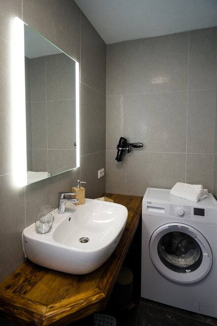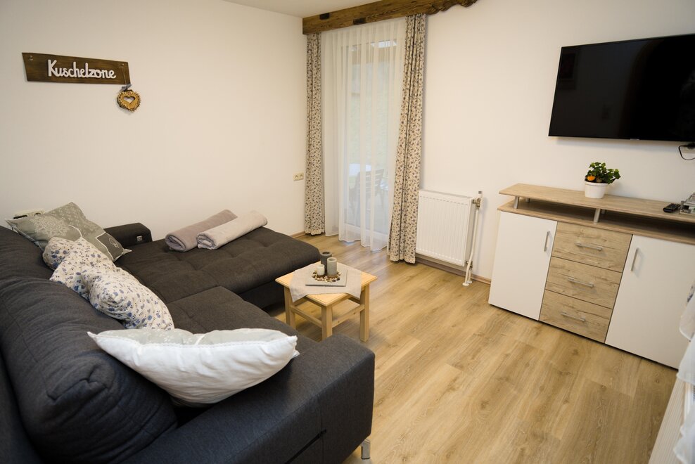 Die Wohnung ist ausgestattet mit Geschirr, Bettwäsche, Waschmaschine, SAT-TV, Radio, Mikrowelle, Zentralheizung und zusätzlichem Kaminofen.