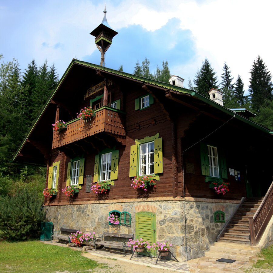 Nach dem Einblick in seine ersten Lebensjahre geht es für uns weiter immer bergab zur Waldschule, die ebenso unbedingt besucht werden muss. Mit Kindern unterwegs wählen wir alternativ den Abstieg über den 8 Kehren langen Forstweg. Entlang des Weges bis zur Waldschule sorgen hier Wegestationen, die die Geheimnisse des Waldes auf spielerische Art erklären - Zum Beispiel ein "Dendrafon" (verschiedenen Hölzern werden mit einem Stab Klänge entlockt), ein Baumtelefon oder ein Baum zum Balancieren - für Kurzweiligkeit. Die Waldschule stellt auch einen zentralen Kreuzungspunkt mehrerer Wanderwege dar: Hier treffen die Zubringerwege aus Mitterdorf im Mürztal, Krieglach und Langenwang auf unseren Rosegger-Weg. Aber zurück zur Waldschule: Wir besuchen das Klassenzimmer von damals und stellen einigermaßen erstaunt fest, dass nebenan auch das Österreichische Wandermuseum beheimatet ist: Zahlreiche alte Schaustücke mit langer Alpinhistorie versetzen uns in die Vergangenheit und lassen alle Bergfexe ins Land der Träume und Geschichten versinken. Der Hauptteil des Museums, die Waldschule, wurde 1902 durch eine Spendenaktion errichtet, die Peter Rosegger startete umso der Landflucht entgegen zu wirken. Nach der Einstellung des Unterrichts wegen Schülermangels im Jahr 1975 wurde das Haus renoviert und beherbergt nun das ehemalige Schulzimmer Peter Roseggers und sein Studierzimmer, in das er sich gerne zurückzog.