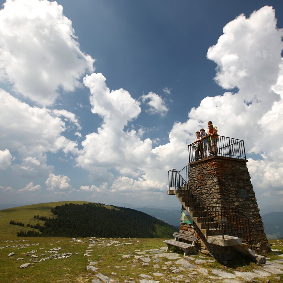 Nach der verdienten Stärkung marschieren wir weiter, zunächst durch Wälder, jedoch bald über die Almmatten und die Hochebene der Fischbacher Alpen, zum Gipfelkreuz des Steinriegels mit seinem Windpark, der direkt am Kamm steht. Die Informationstafeln erzählen uns Näheres über die ökologische Energiegewinnung durch Windkraft. Weiter geht es über die Rattner Alm Richtung Pretul zum Rosegger Schutzhaus mit der wenige Gehminuten oberhalb liegenden Peter-Bergner Warte. Das Schutzhaus, benannt nach unserem Wegbegleiter Peter Rosegger, bietet uns zum Ausspannen nicht nur einen wunderschöne Panoramaterrasse, sondern serviert uns auch typisch steirische Speisen und Getränke – vor allem den Schwarzbeerstrudel (Heidelbeeren) sollte man nicht versäumen! Die erwähnte Aussichtswarte wurde nach dem im Jahr 1904 ermordeten Hüttenwirt des Rosegger Schutzhauses benannt. Viele meinen, dass dies sogar als erstes dokumentiertes Alpinverbrechen genannt werden kann. Die Warte gibt uns einen imposanten und unvergesslichen Aus- und Einblick in die vielfältigen Landschaften Ostösterreichs bis nach Ungarn.