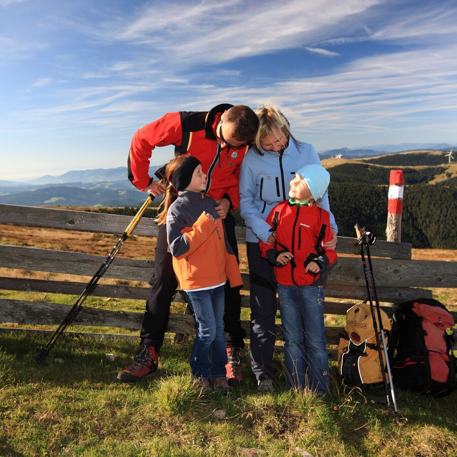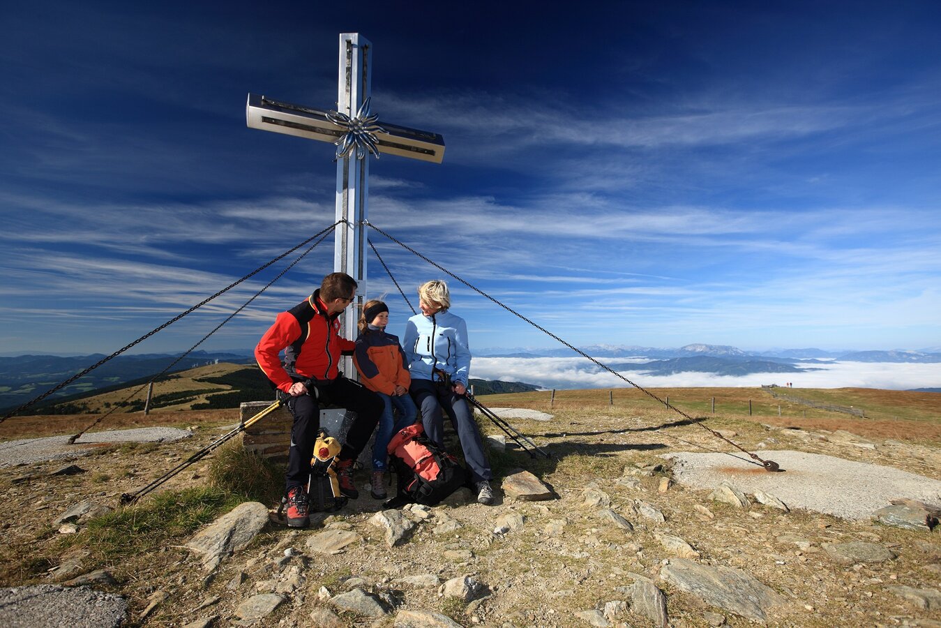 Die Genüsse – kulinarische wie auch landschaftliche – verdauend wandern wir nun weiter über die weiten Almwiesen des Stuhleck. Zunächst empfängt uns noch der Grazer Stuhleck, bevor es zu seinem großen Bruder noch bergauf geht. Am Schwarzriegel treffen noch weitere zwei Zubringer auf unseren Rosegger-Weg: der Planetenweg aus Rettenegg und die historische Alpintour auf den Spuren der Skipioniere Toni Schruf und Max Kleinoscheg von Mürzzuschlag herauf auf das Stuhleck. Immer wieder beeindruckt entlang dieses Wegabschnittes das faszinierende Panorama, das es nur hier am äußersten Ostrand der Alpen gibt. Denn nirgendwo im gesamten Alpenraum liegen einem hochalpine Gipfel und Gebirgszüge wie Rax, Hochschwab, Gesäuse oder Dachstein wie auch die sanften Hügellandschaften Ostösterreichs und Westungarns mit ihren Feldern, Apfel- und Weingärten so unmittelbar zu Füßen. Nach dem letzten Anstieg gelangen wir schlussendlich zu unserem Ziel, dem Stuhleck. Die 360° Panoramaübersichtstafel neben dem Gipfelkreuz gibt uns noch einmal   Einblick, welche Landschaften und Bergzüge unsere Wegbegleiter auf der Tour durch Peter Roseggers Waldheimat waren. Und um auch ein wenig ins Wirken Roseggers hineinschnuppern zu können: Der Eintrag ins Gipfelbuch darf zum Schluss natürlich nicht fehlen!