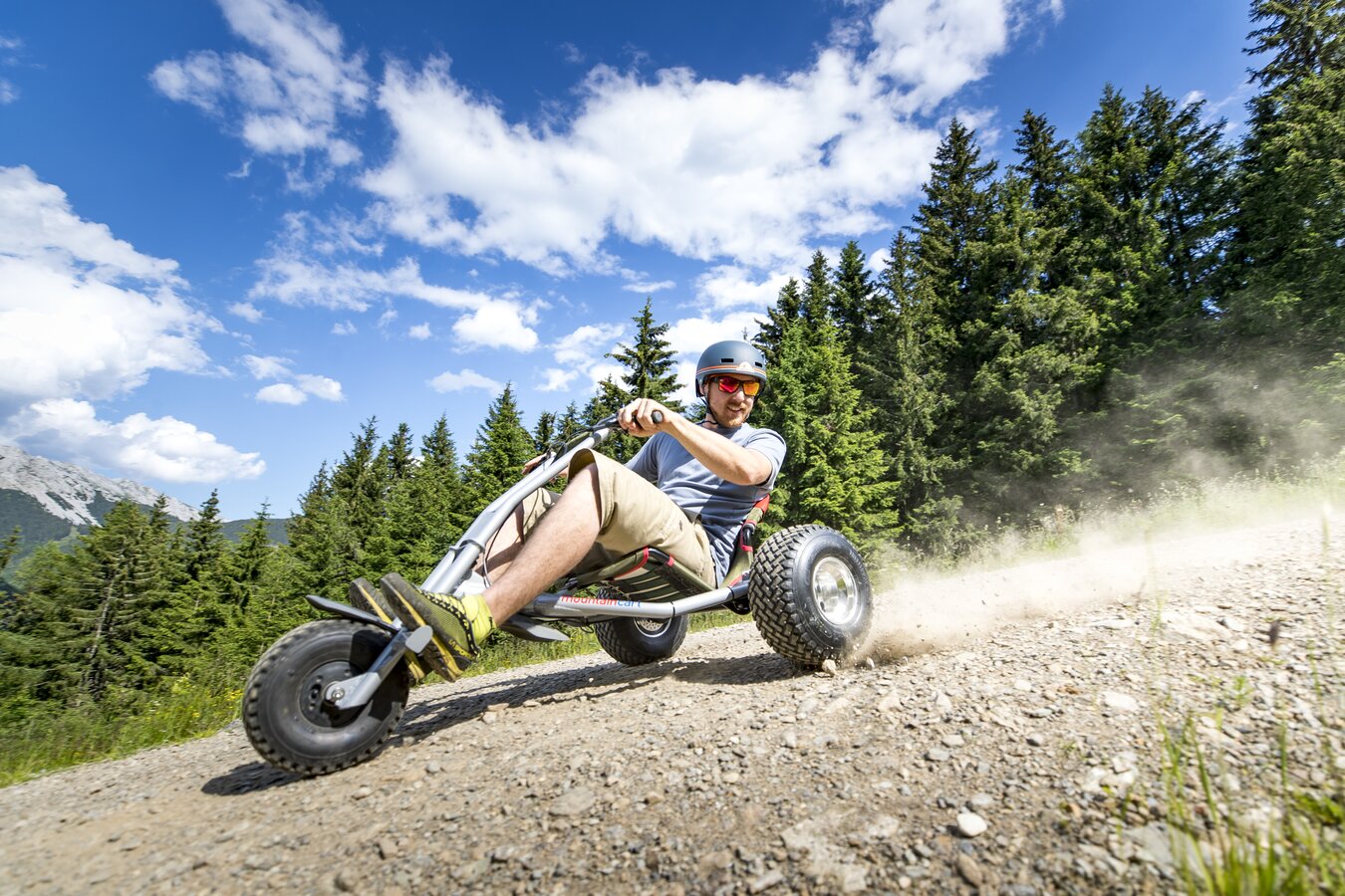 Wer nicht selbst treten will, sondern lieber rollt, auf den wartet in Murau am Kreischberg eine rasante Abfahrt – entweder auf dem Mountain Kart oder für Wagemutige auf dem Monsterroller. Die rund 4,5 Kilometer lange Abfahrt zur Mittelstation ist gut ausgebaut und ermöglicht sogar das eine oder andere Überholmanöver.