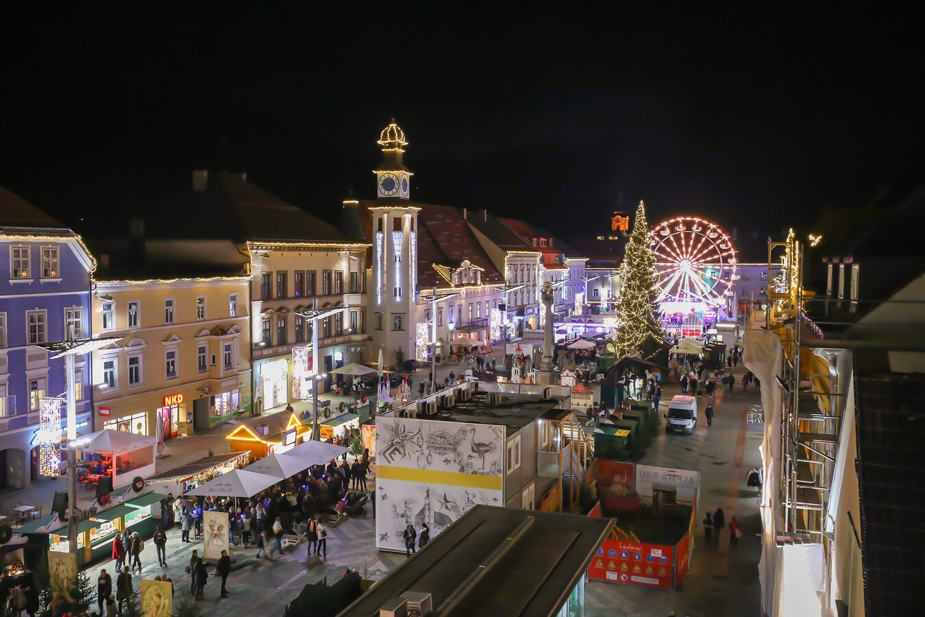 Vom Riesenrad aus Richtung Berge blicken: Vom 22. November bis zum 23. Dezember 2024 lädt der „Leobener Christkindlmarkt“ in der Region Erzberg Leoben seine Gäste zur Advent-Vorfreude ein. Der große geschmückte Christbaum und die leuchtenden Lichterketten hüllen den Hauptplatz der Altstadt von Leoben in eine besonders licht-erfüllte Atmosphäre.