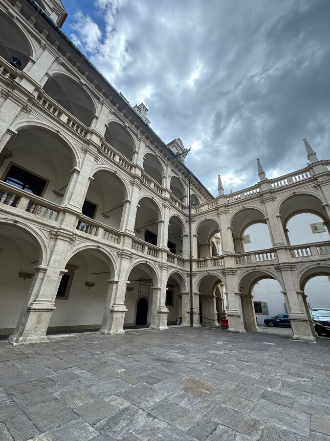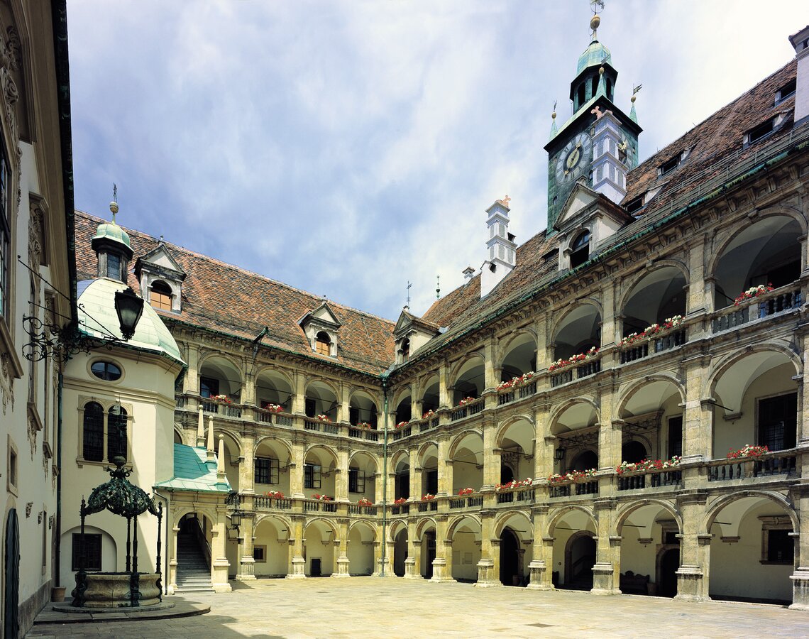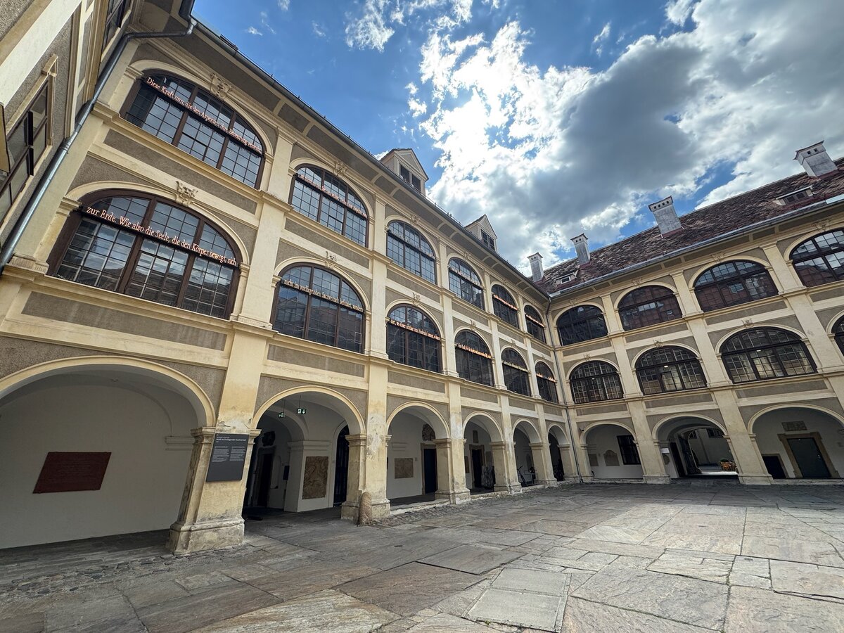 Wir beginnen im wohl bekanntesten Innenhof der Stadt: dem Landhaushof. Mit seinen eleganten Arkadengängen und der symmetrischen Klarheit ist er ein Paradebeispiel für italienische Renaissancebaukunst nördlich der Alpen. In den oberen Geschossen tagen heute noch politische Gremien – unten trifft man sich in glanzvoller Atmosphäre bei Konzerten, Theateraufführungen und Festen aller Art.