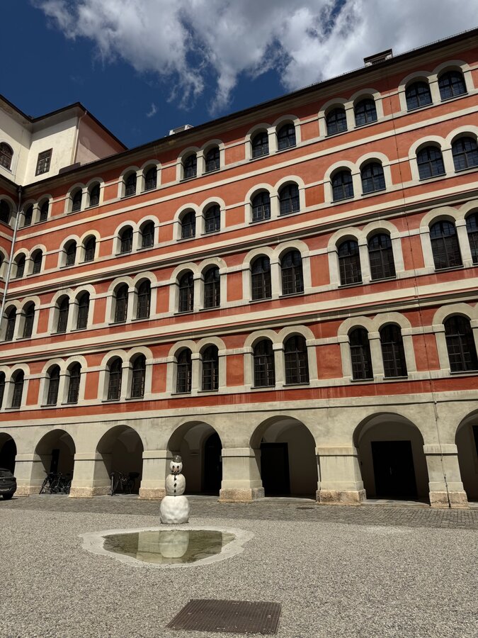 Ein paar Gehminuten entfernt öffnet sich die Stadt in den Hof des Priesterseminars – einer jener Orte, die man nicht auf Postkarten findet, aber nie wieder vergisst, wenn man sie einmal gesehen hat. Rote Mauern, hohe Fenster und ein einsamer Schneemann lassen hier nachdenklich werden. Letzterer starrt seit 2005 auch im Hochsommer in sein eigenes Schmelzwasser und erinnert uns leise an Vergänglichkeit.