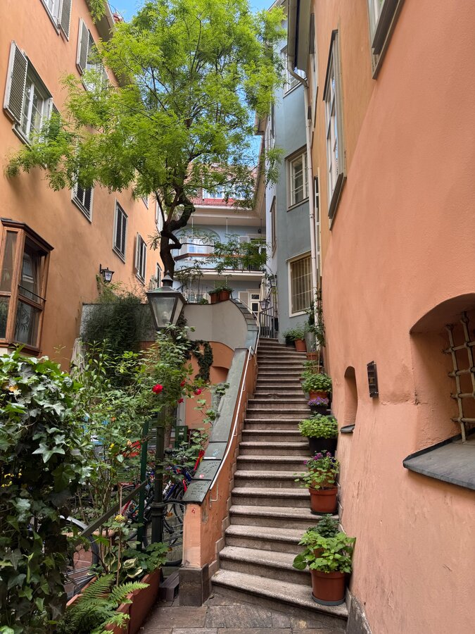 Wenige Meter weiter überrascht der Franziskanerhof mit seiner besonderen Aura. Der angrenzende Kreuzgang des Klosters strahlt eine tiefe Ruhe aus – kein Wunder, dass dieser Hof für viele ein Lieblingsort ist. Wenn im Sommer die Obstbäume blühen und irgendwo eine Geige übt, fühlt man sich wie in einem kleinen toskanischen Dorf.