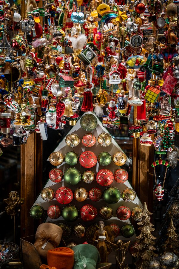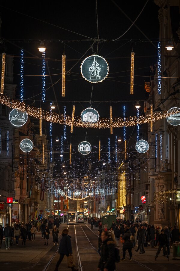 Die Herrengasse ist ein Highlight für sich und glitzert in der Weihnachtszeit ganz besonders. Tausende Lichtlein schließen sich hier zu Grazer Motiven zusammen und beleuchten die Stadt von oben. Unten funkeln währenddessen die Schaufenster – so zum Beispiel beim Geschenkladen Haller. Als Grazer Unikat gehört er zu jedem guten Weihnachtsausflug dazu, um die unzähligen Christbaumkugeln zu bestaunen. Und wer Glück hat, sieht in der Weihnachtszeit vielleicht sogar die gänzlich geschmückte Advent-Bim vorbeifahren.