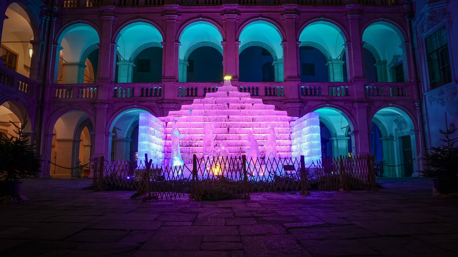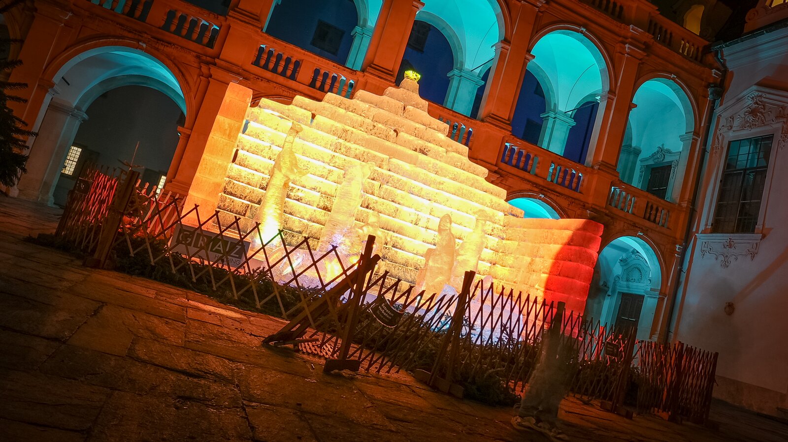 Sie ist ein Fixtermin auf dem Grazer Weihnachtskalender und eine Legende in ihrem eigenen Sinn. Bekannt über die Landesgrenzen hinaus und alle Jahre wieder andächtig. Die Grazer Eiskrippe ist die größte ihrer Art und ziert mit ihren schlanken 35 Tonnen den Landhaushof. Als wir dort ankommen, spielt treffenderweise gerade ein Musiker sanfte Klänge auf seiner Harfe und verleiht dem Platz eine anmutige Atmosphäre.
