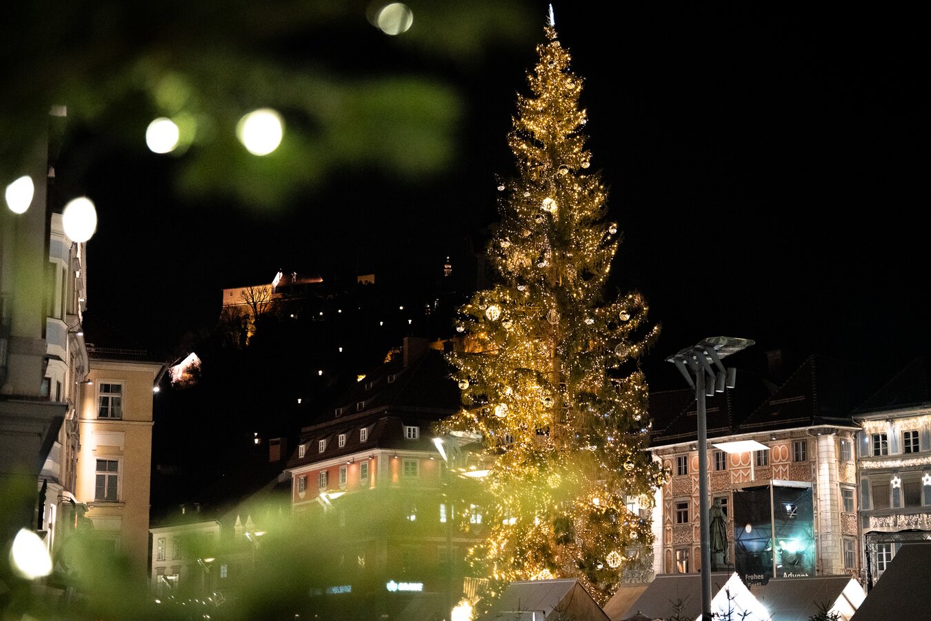 Das Herzstück des Grazer Advents ist ohne Frage der Hauptplatz mit seiner wunderschönen Weihnachtslandschaft. Hier herrschen tatsächlich 360° Weihnachten, wo das Auge hinfällt – ob südlich zum Rathaus, dessen Fassade mit einem Adventskalender beleuchtet ist, ob nördlich zum Christbaum, der mit den Hütten um die Wette funkelt, oder ob zum Himmel hinauf, wo die Grazer Lichtersegel Stimmung verbreiten und sich mit den Wahrzeichen der Stadt schmücken. Hier gibt es Kunst, Punsch und Kulinarik, es duftet und funkelt und wir sind im Himmel.