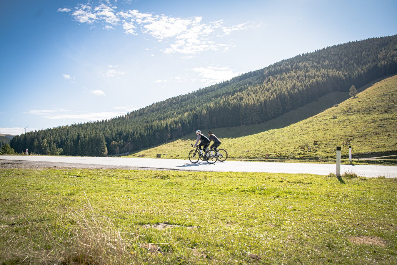 Oben auf der Sommeralm folgen wir der hügeligen Straße, die vorbei am imposanten Windrad führt. Die kurvigen Streckenverläufe, die knackigen Anstiege und rasanten Abfahrten machen diesen Abschnitt zur perfekten Rennradstrecke. Während wir immer wieder den Blick über die endlosen Almen schweifen lassen, spüren wir langsam, aber sicher die Erschöpfung. Deshalb kehren wir schließlich um und legen einen erfrischenden Stopp bei der Stoakoglhütte auf rund 1.400 Metern Seehöhe ein. Wir bedienen uns an der Almbar und gönnen unseren Beinen eine kurze Pause. Der Ausblick von der Hütte über die Herbstlandschaft lädt uns dann auch noch dazu ein, die Pause etwas zu verlängern.