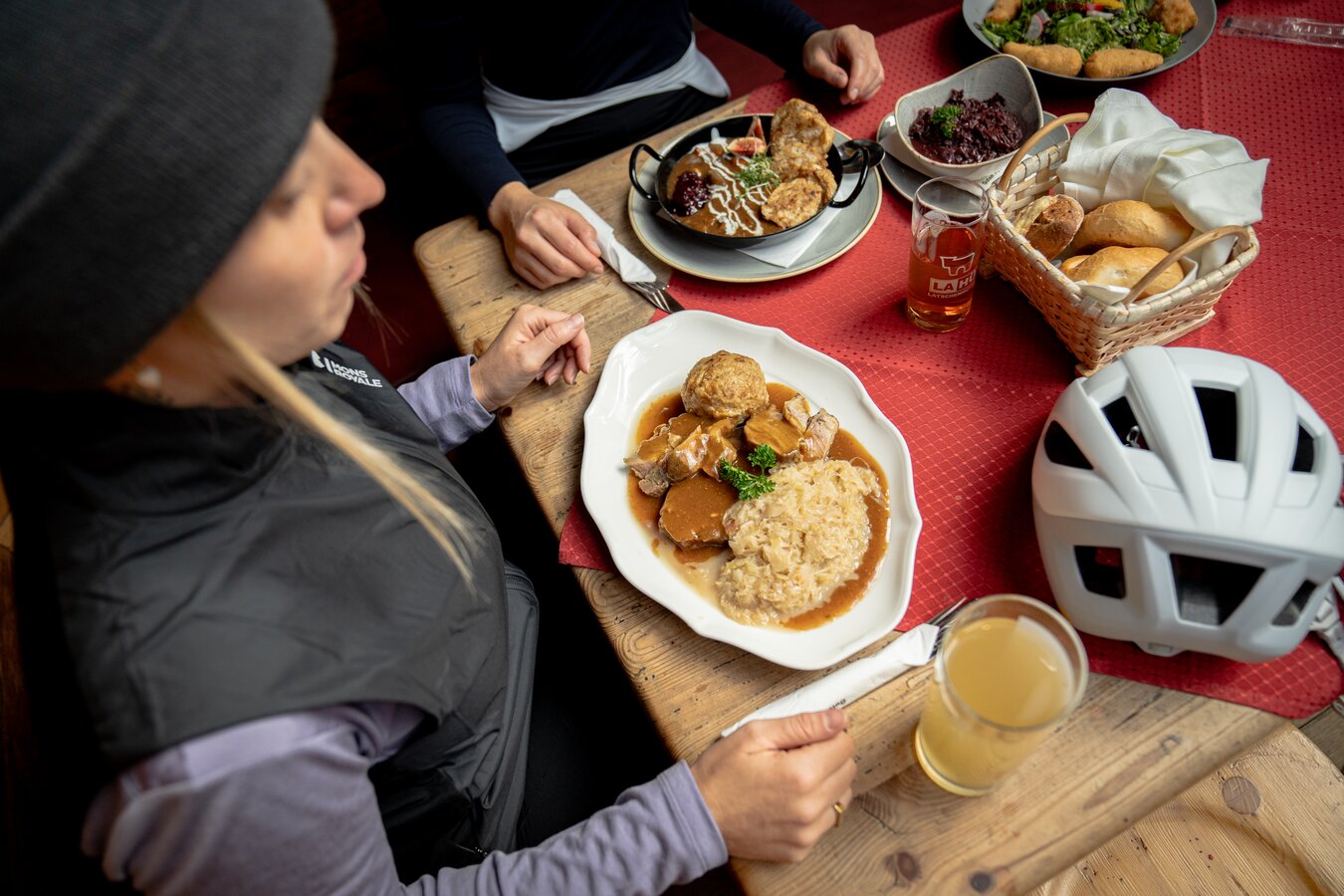 Erholt geht es weiter Richtung „Heimat“. Nach einem kurzen Anstieg folgt der aufregendste Teil der Tour: die Abfahrt. Auf der kurvigen Strecke runter von der Sommeralm werden wir immer schneller, und den Schwung nehmen wir mit, bis wir schließlich bei der Latschenhütte (Lahü) ankommen. Hier legen wir unsere wohlverdiente kulinarische Pause ein. Auf der Tageskarte standen Rehragout und Schweinsbraten. Die deftigen Speisen waren genau das Richtige nach den vielen Höhenmetern und die Hütte bietet eine gemütliche Atmosphäre zum Durchatmen und Regenerieren. Das Dessert lassen wir, mit dem Wissen, dass uns noch ein letzter Anstieg bevorsteht, dann trotzdem lieber aus.