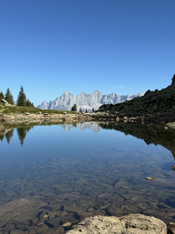 Wer etwas mehr Höhenmeter und Abwechslung sucht, findet am Reiteralm Höhen-Rundweg das passende Pendant. Zwei Gipfel, zwei Seen und ein eindrucksvoller Blick auf den Dachstein machen die Runde besonders lohnend. Am Spiegelsee spiegelt sich das erste Licht des Tages im ruhigen Wasser – ein Bild, das bleibt.