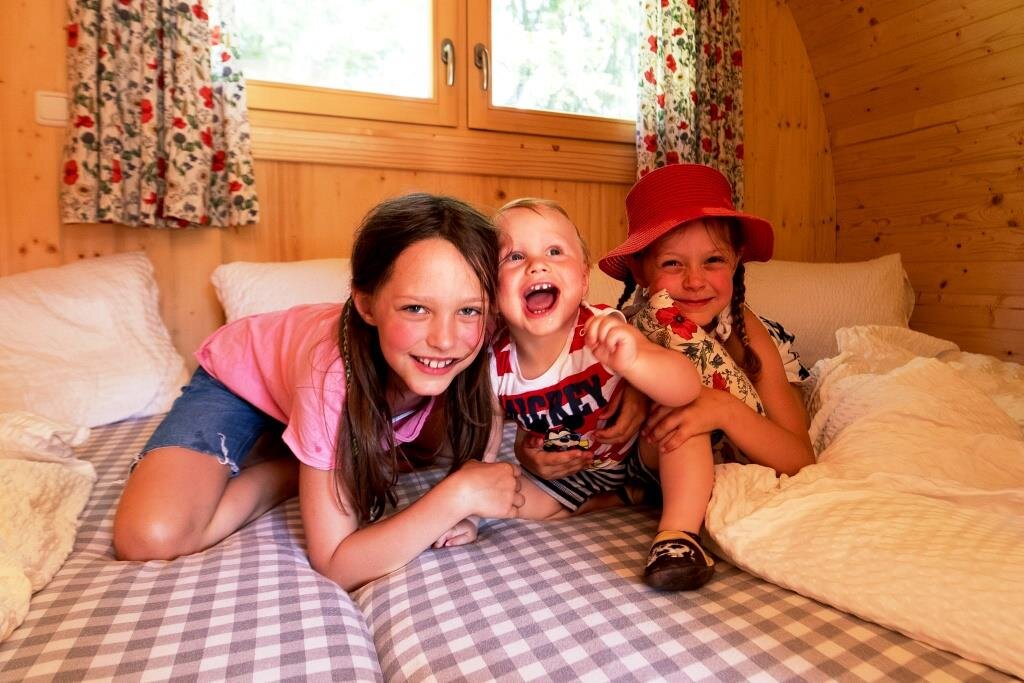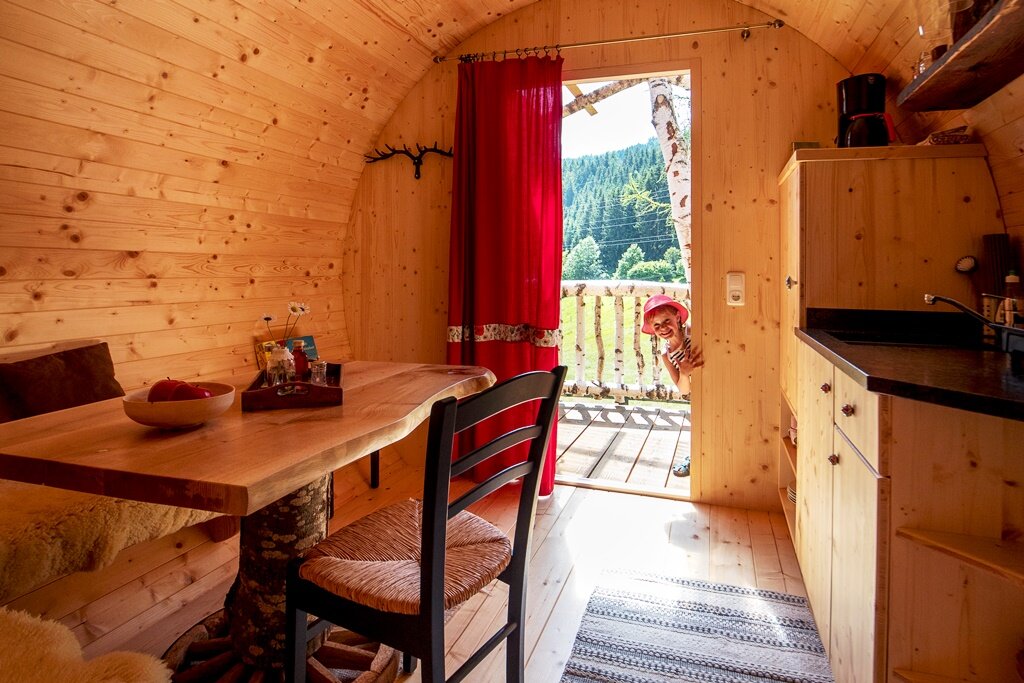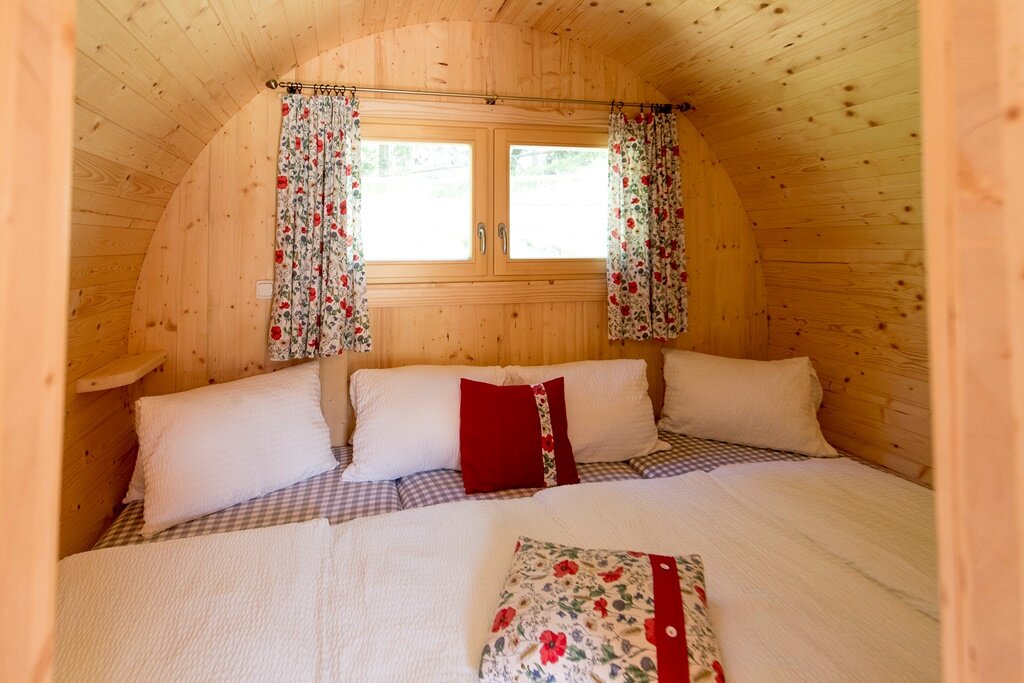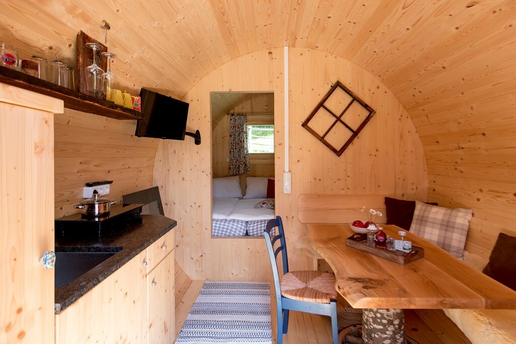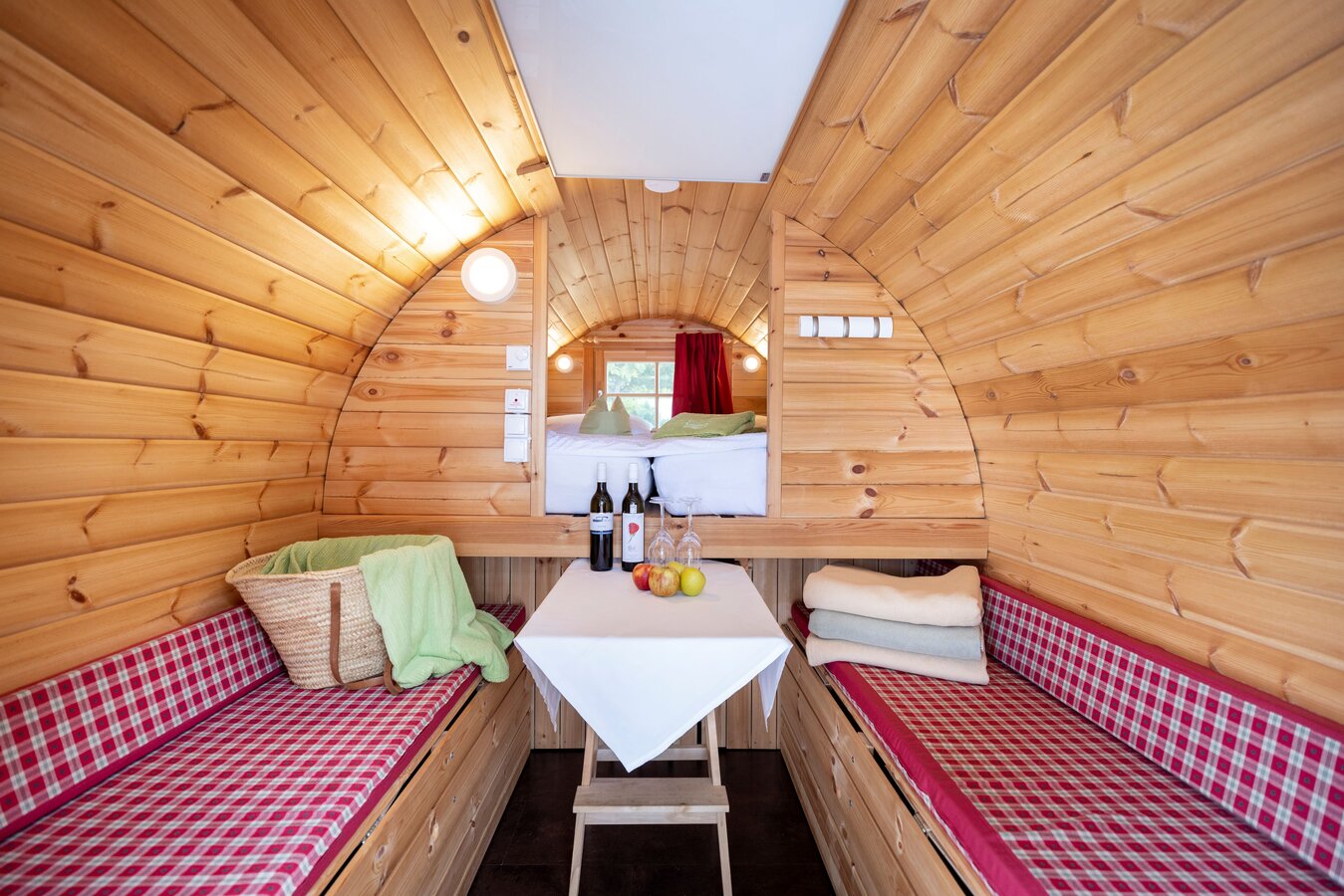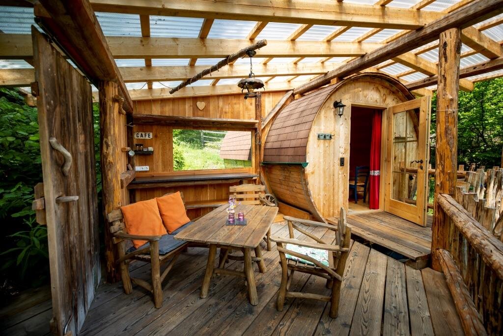 Ein urgemütliches Holzfass, umgebaut zur Übernachtungsmöglichkeit – rustikal, charmant und mit dem gewissen Hüttenzauber. Und das ist komfortabler als es vielleicht klingen mag. Dank einer großen, überdachten Terrasse hat man auch im Freien genügend Platz und ist gut vor Wind und Wetter geschützt. Perfekt, um sich nach den ersten Kilometern zu regenerieren.