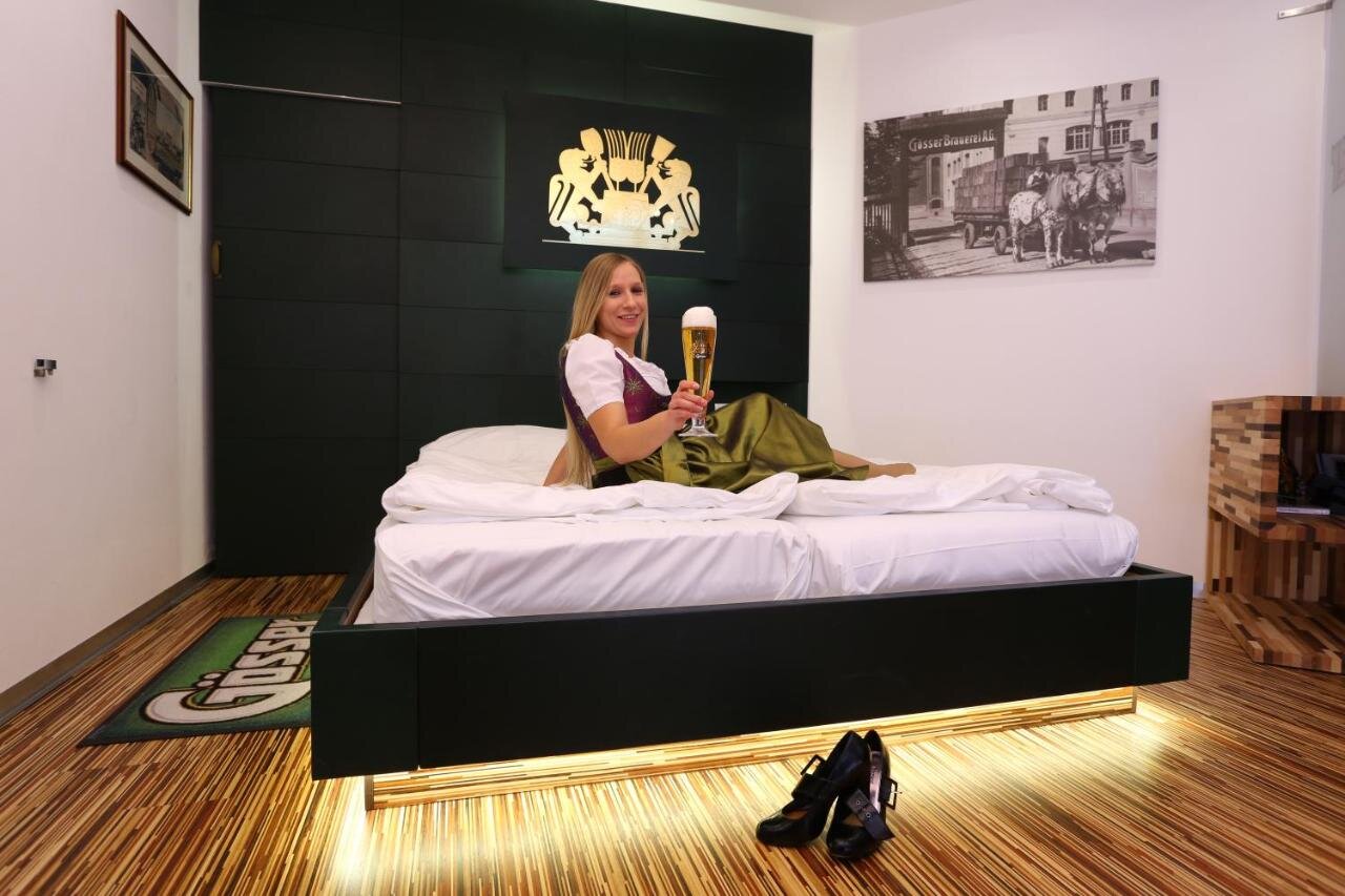 Wem das zu viel Eisen ist, der kann sich stattdessen ins „Gösser Zimmer“ zurückziehen. Hier fließt das Bier direkt aus der Zapfanlage ins Glas – und das Beste daran: Der frische Gerstensaft vom Fass ist bereits im Übernachtungspreis enthalten. Prost auf einen unvergesslichen Aufenthalt!