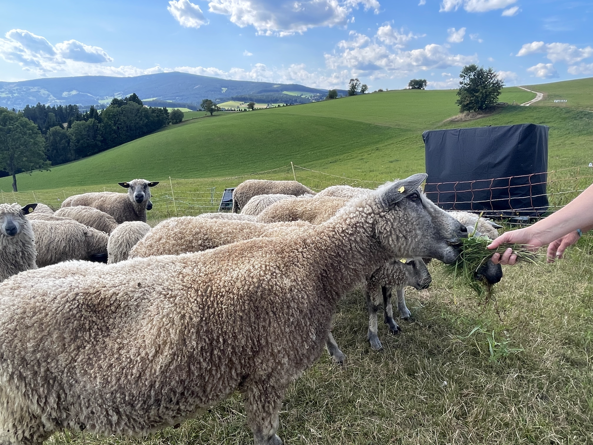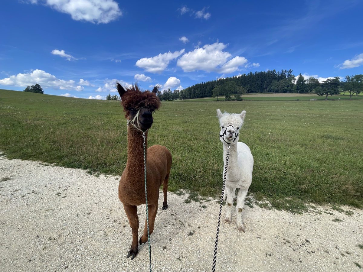 Der Hof beherbergt Alpakas, Wensleydale-Schafe, Hühner und Katzen. Ein absolutes Highlight ist die malerische Wanderung mit den Alpakas. Der Rundweg ist barrierefrei gestaltet und somit auch mit Kinderwagen oder Rollstuhl passierbar. Entlang des Wegs informieren Tafeln über Alpakas und Hofprodukte. Rastplätze laden zum Verweilen und Genießen der wunderschönen Rundumblicke ein. Spielerisches Lernen und Naturerlebnis in einem.