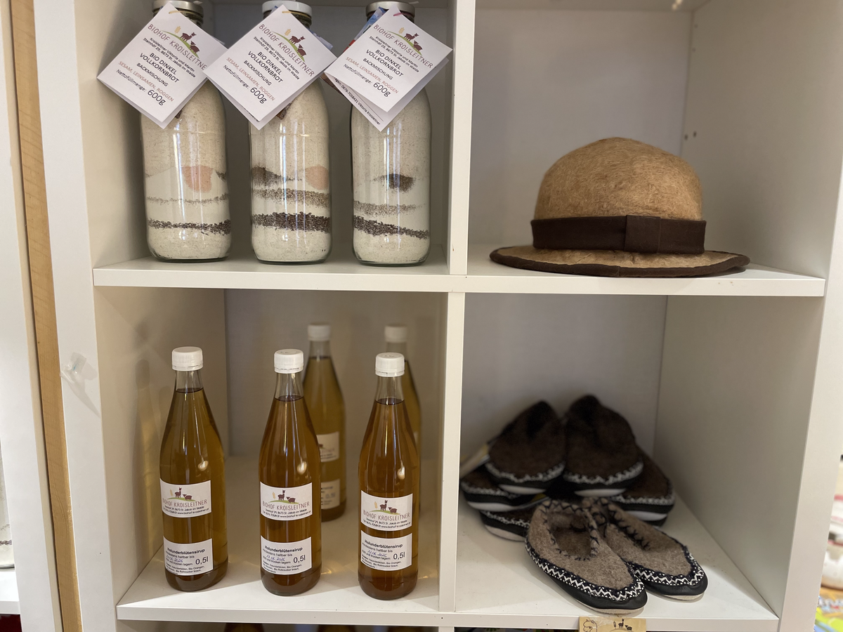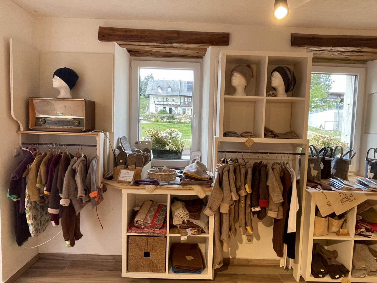 Die Wolle der Tiere wird größtenteils vor Ort verarbeitet, die daraus erzeugten Produkte sind im eigenen Hofladen oder im Online-Shop gekauft erhältlich. Unser Tipp: Hochwertige, wärmende Baby-Outdoorjacken und Hauben! Frisch gemahlenes Mehl, Brotbackmischungen und selbstgemachte Sirupe gibt’s ebenfalls.