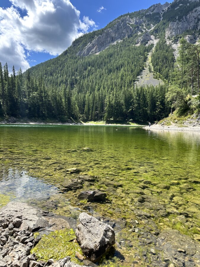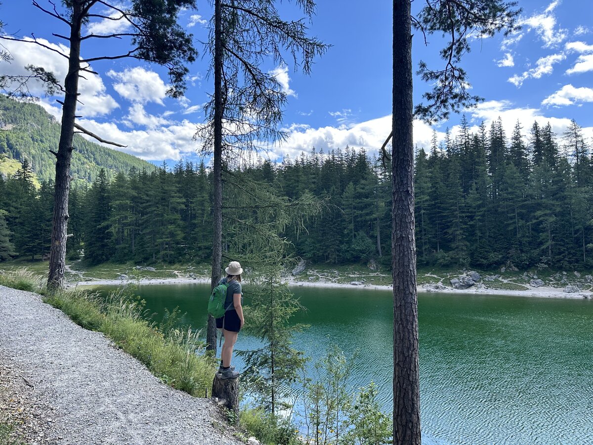 Unweit von „Alpakas, Lamas & Rentiere zum Grünen See“ liegt nämlich – wie der Name verrät – der Grüne See. Und als 2014 gekürter „Schönster Platz Österreichs“ können wir diesen bestimmt nicht auslassen. Das Wasser leuchtet in verschiedenen Grüntönen und ist so klar, dass man bis auf den Grund sehen kann. Wir starten unsere Wanderung auf dem neuen barrierearmen Rundweg, der um den kompletten See führt.