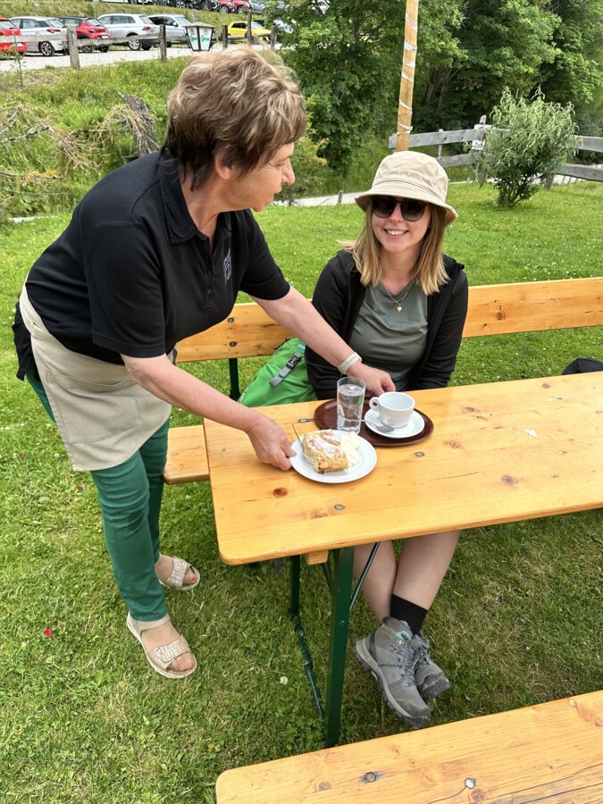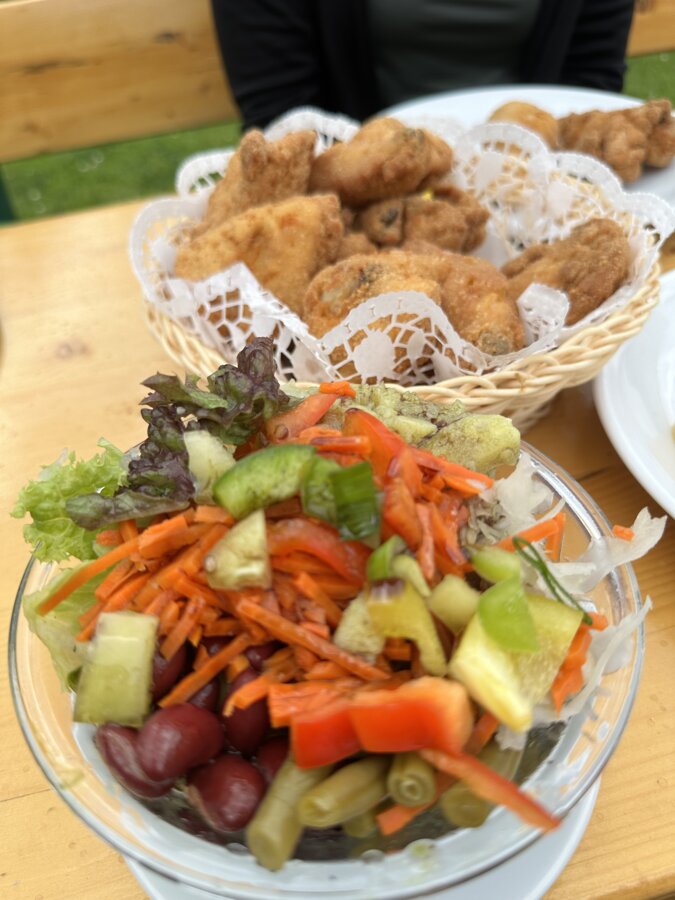 …bis uns der Hunger packt. Und da ist glücklicherweise das Almwirtshaus zum Hiaslegg nicht weit. Hier serviert uns Hausherr Heimo persönlich sein berühmtes Backhendl. Das Fleisch ist zart, die Panier goldbraun und knusprig, der Salat frisch und knackig. Während wir noch genießen, kommt Hausherrin Inge mit Cremeschnitte und Kaffee um die Ecke gebogen. Weitblick über die Almen und ein voller Magen – das Leben ist schön.