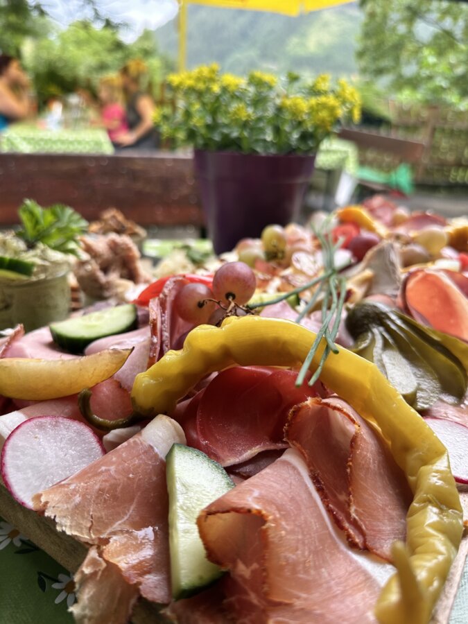 Kurz vor Ende der Wanderung kommen wir an der Hirn-Alm vorbei und können zu einer gut-steirischen Brettljause nicht nein sagen. Hoch getürmt mit heimischen Schmankerln bestellen wir dann doch mehr als ursprünglich gedacht, und Hausherr Pauli sucht nach den letzten freien Fleckerln auf unserem Tisch.