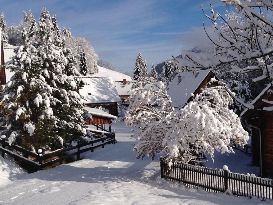 Unser Holzhaus steht in einer kleinen Blockhäuser-Siedlung ca. 900 Meter außerhalb des Ortes St. Lambrecht im Naturpark Zirbitzkogel-Grebenzen (Region Murau).