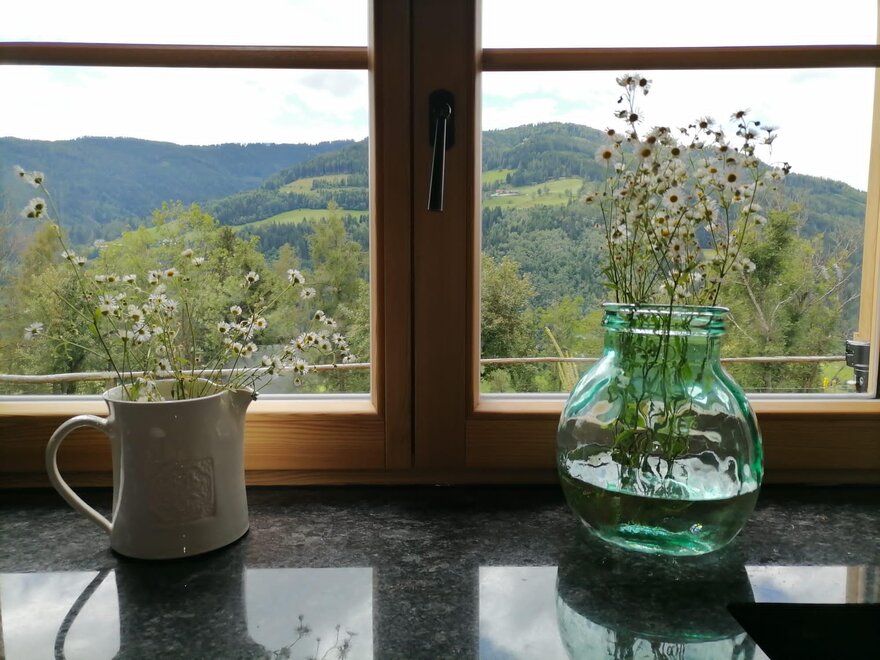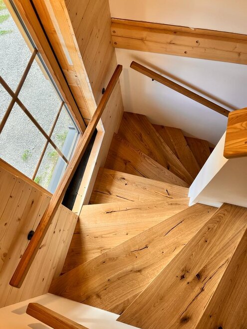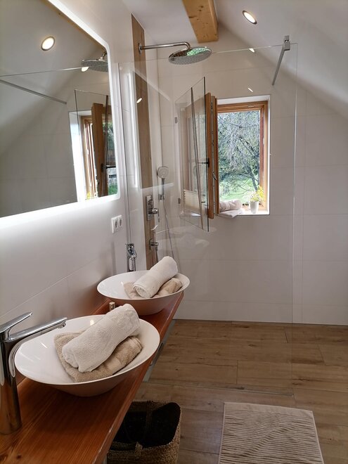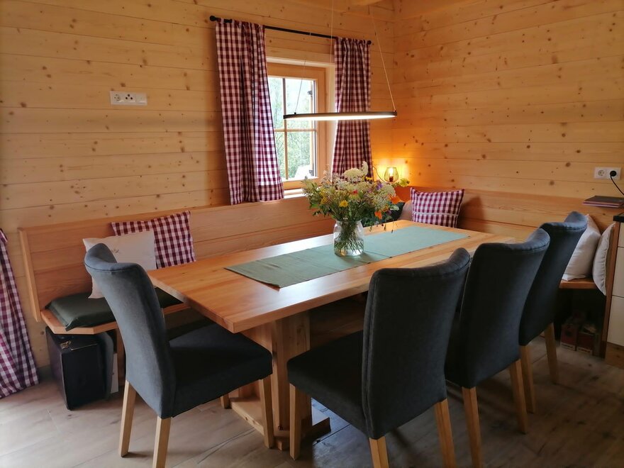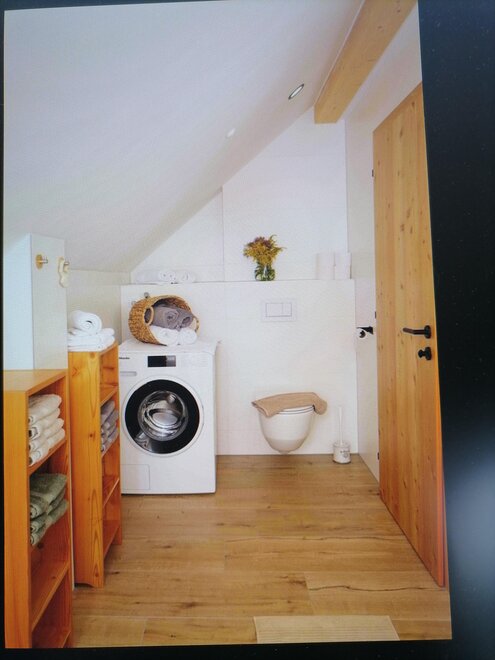 Der untere Bereich des Haus besteht aus einem Schlafzimmer, einem WC mit Waschtisch und Spiegel, einem Abstellraum, ein Vorhaus mit Garderobe und dem Herzstück der Wohnkuchl mit handgemachten Holzmöbeln. Dieser Raum verfügt außerdem über einen wunderschönen handgemachten Holzofen mit roten Kacheln, der noch weitere Gemütlichkeit in diesen Raum zaubert. Die einladende Holztreppe führt in den oberen Bereich. Dort befinden sich zwei weitere Schlafzimmer sowie das Badezimmer mit Ausblick direkt in die Natur. Im Badezimmer befinden sich ein WC, eine Dusche, zwei Waschbecken, eine Waschmaschine sowie weitere Abstellmöglichkeiten.