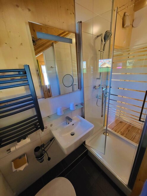 - einem dazugehörigen Badezimmer (Dusche, Waschbecken, WC, Fön)