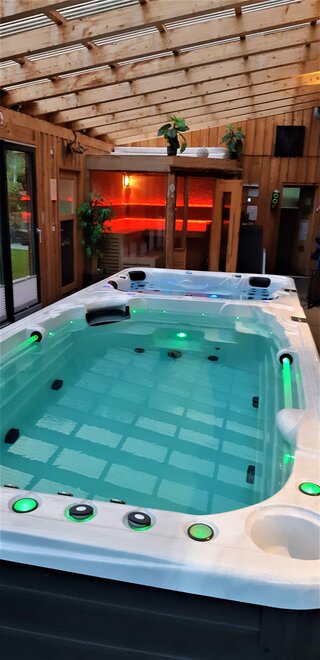 - der Swimspa, bestehend aus Schwimmbereich mit Gegenstromanlage und einem Whirlpool (595 x 225 cm) zum Verweilen ein.